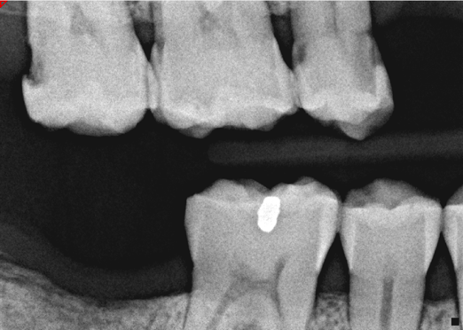 A 42-year-old male patient with a unremarkable health history presented in the AEGD Residency Program clinic with a chief complaint of pain in the mandibular right posterior area. Fig- ure 30 shows an unremarkable occlusal view of tooth No. 29; however, the radiograph showed deep distal caries near the root canal (Figure 31). Several treatment options were discussed with the patient, including extraction, root canal therapy, post and crown, and a distal occlusal composite that would later serve as a "margin elevation" material following endodontic therapy and preparation for a distal occlusal ceramic inlay or onlay. The patient chose the latter option.