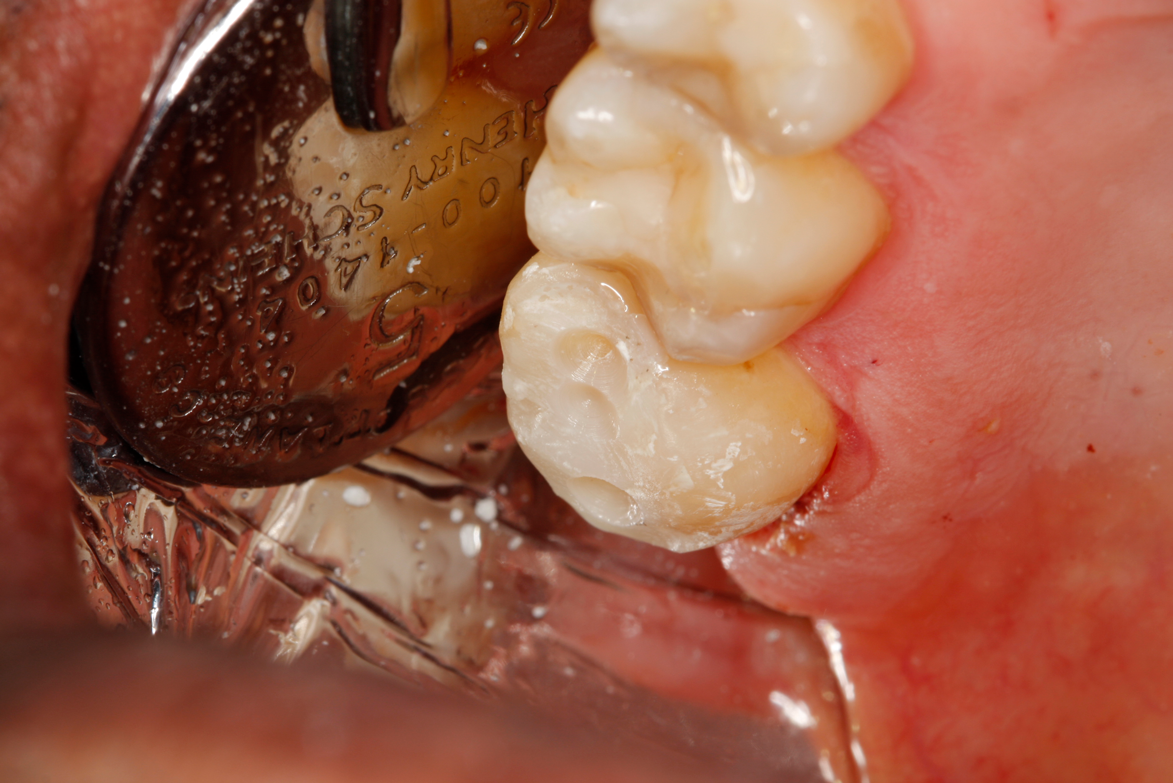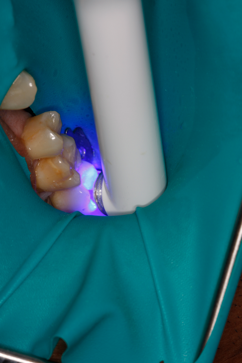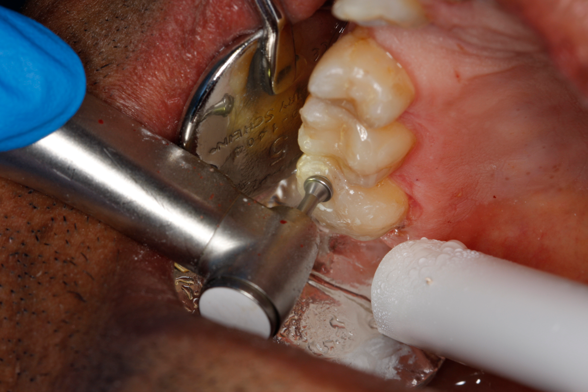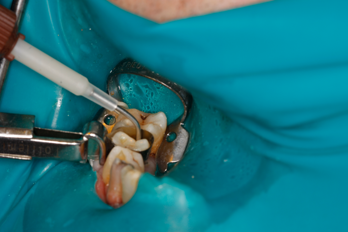 Figure 8A is a radiograph revealing deep root caries previously restored temporarily by a resident at the AEGD Residency Program clinic with glass ionomer utilizing a lateral rather than occlusal approach. After the glass ionomer failed to adhere, another resident again attempted a lateral approach that resulted in the restoration shown in Figure 8B. A third resident had success with an occlusal approach, removing a failed occlusal composite to access the distal (Figure 9). This attempt was successful both in the preparation of the lesion and in the placement of a dual- cure bulk-fill flowable (Bulk EZ Plus, Zest Dental Solutions; alternatively: HyperFIL®, Parkell; Fill-Up!, Coltene) extruded through a bendable needle (Figure 10). Figure 11 shows the final preparation after tissue removal was accomplished with rotary gingitage; note that this was performed with the rubber dam in place. An air abrasion device (Groman Etchmaster, Groman Dental; alternatively: PrepStart™ H2O, Zest Dental Solutions; Bioclear Blaster, Bioclear) was used with potassium bicarbonate to remove biofilm prior to acid etching (Figure 12). Phosphoric acid 37% was utilized in a total etch fashion (Fig- ure 13 and Figure 14) for 20 seconds. Figure 15 shows the universal bond (Scotchbond™ Universal, 3M; alternatively: All-Bond Universal®, BISCO; Prelude One, Danville Materials) with metha- cryloyloxydecyl dihydrogen phosphate (MDP) being scrubbed into the cavity for 20 seconds. After air thinning for 20 seconds, the adhesive was light cured for 40 seconds at 1,200 mw/cm2power density (Figure 16).