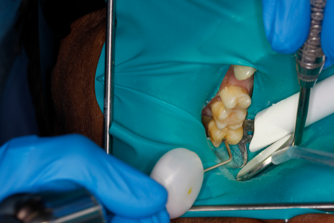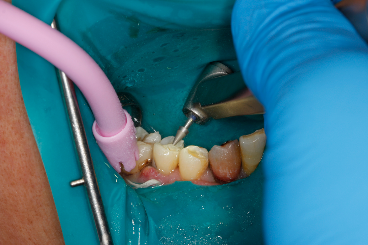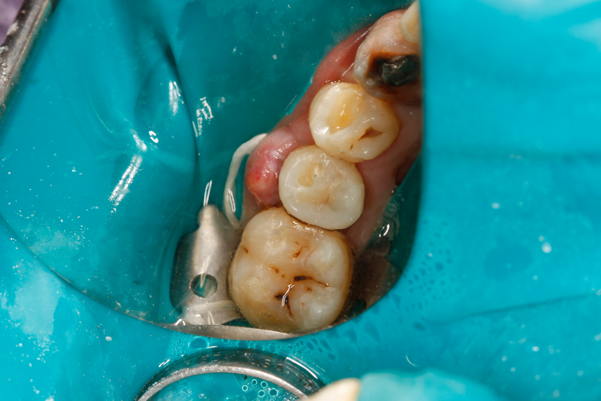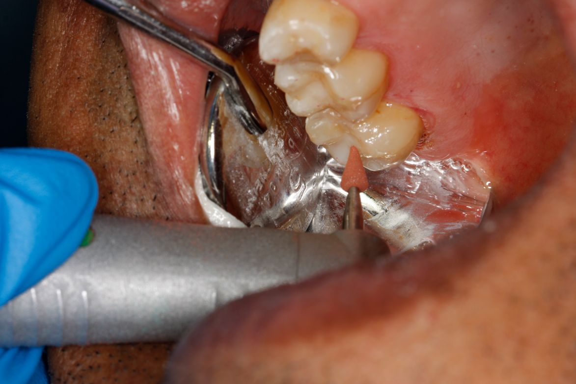 Figure 8A is a radiograph revealing deep root caries previously restored temporarily by a resident at the AEGD Residency Program clinic with glass ionomer utilizing a lateral rather than occlusal approach. After the glass ionomer failed to adhere, another resident again attempted a lateral approach that resulted in the restoration shown in Figure 8B. A third resident had success with an occlusal approach, removing a failed occlusal composite to access the distal (Figure 9). This attempt was successful both in the preparation of the lesion and in the placement of a dual- cure bulk-fill flowable (Bulk EZ Plus, Zest Dental Solutions; alternatively: HyperFIL®, Parkell; Fill-Up!, Coltene) extruded through a bendable needle (Figure 10). Figure 11 shows the final preparation after tissue removal was accomplished with rotary gingitage; note that this was performed with the rubber dam in place. An air abrasion device (Groman Etchmaster, Groman Dental; alternatively: PrepStart™ H2O, Zest Dental Solutions; Bioclear Blaster, Bioclear) was used with potassium bicarbonate to remove biofilm prior to acid etching (Figure 12). Phosphoric acid 37% was utilized in a total etch fashion (Fig- ure 13 and Figure 14) for 20 seconds. Figure 15 shows the universal bond (Scotchbond™ Universal, 3M; alternatively: All-Bond Universal®, BISCO; Prelude One, Danville Materials) with metha- cryloyloxydecyl dihydrogen phosphate (MDP) being scrubbed into the cavity for 20 seconds. After air thinning for 20 seconds, the adhesive was light cured for 40 seconds at 1,200 mw/cm2power density (Figure 16).