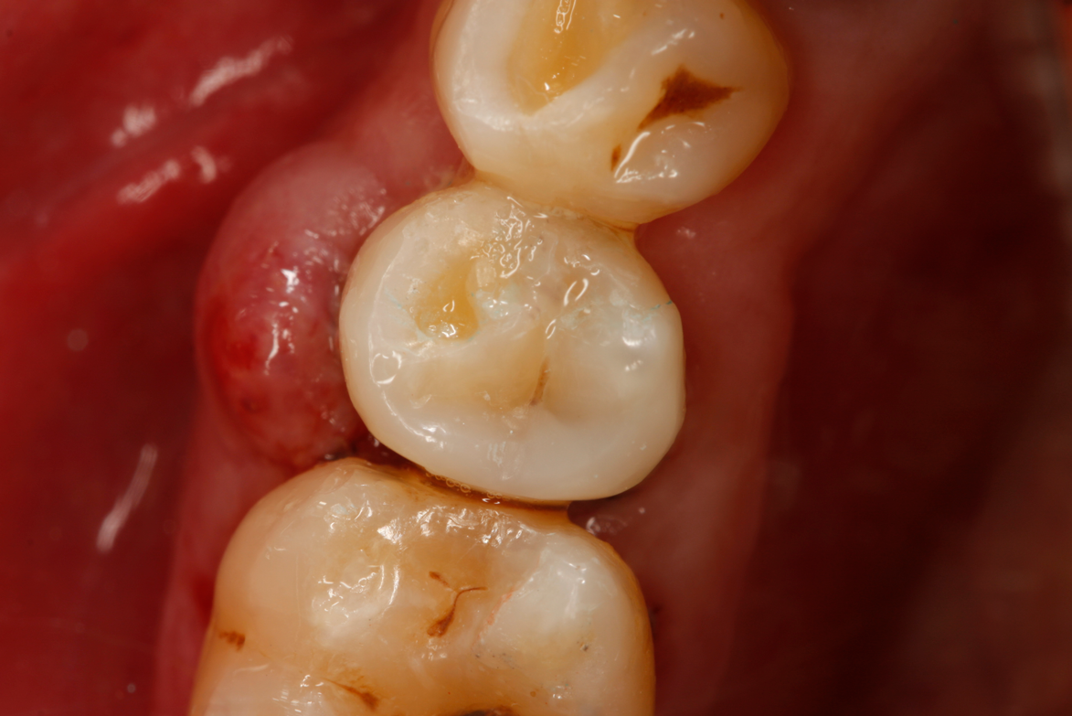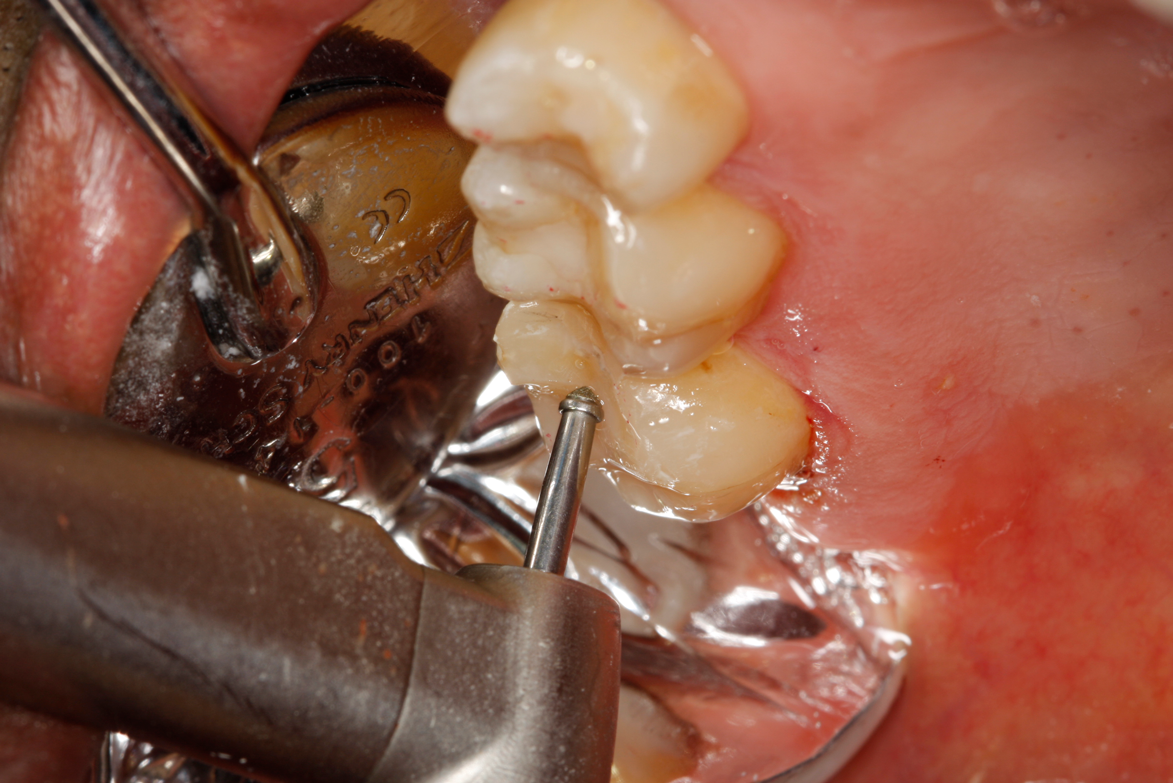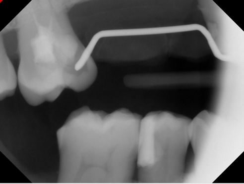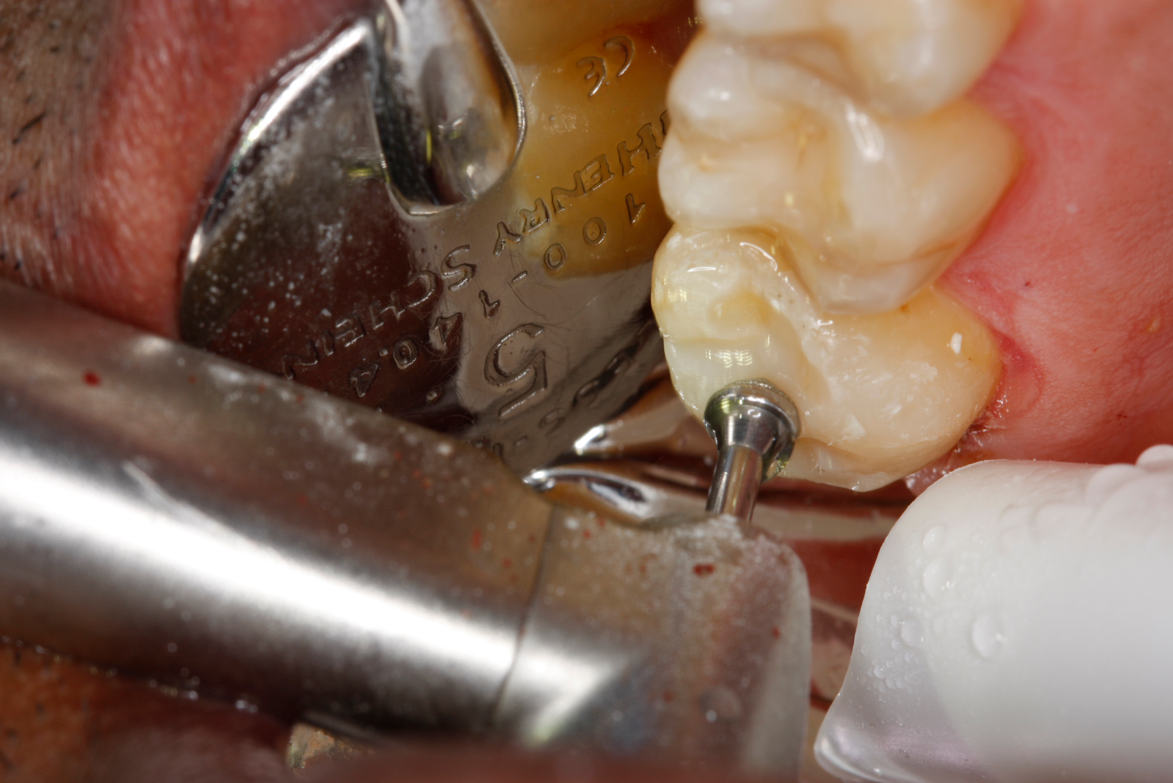A 77-year-old male patient presented in the author's AEGD Residency Program clinic with a chief complaint of sensitivity in the maxillary right posterior area. He had an unremarkable health history, and after a thorough examination, he was presented with several treatment options: minimally invasive drill access, performed laterally, filled with glass ionomer (poor prognosis); distal occlusal composite resin with an occlusal approach (preexisting occlusal resin apparent); or a distal occlusal ceramic onlay. The patient chose the first option of restoration with glass ionomer.