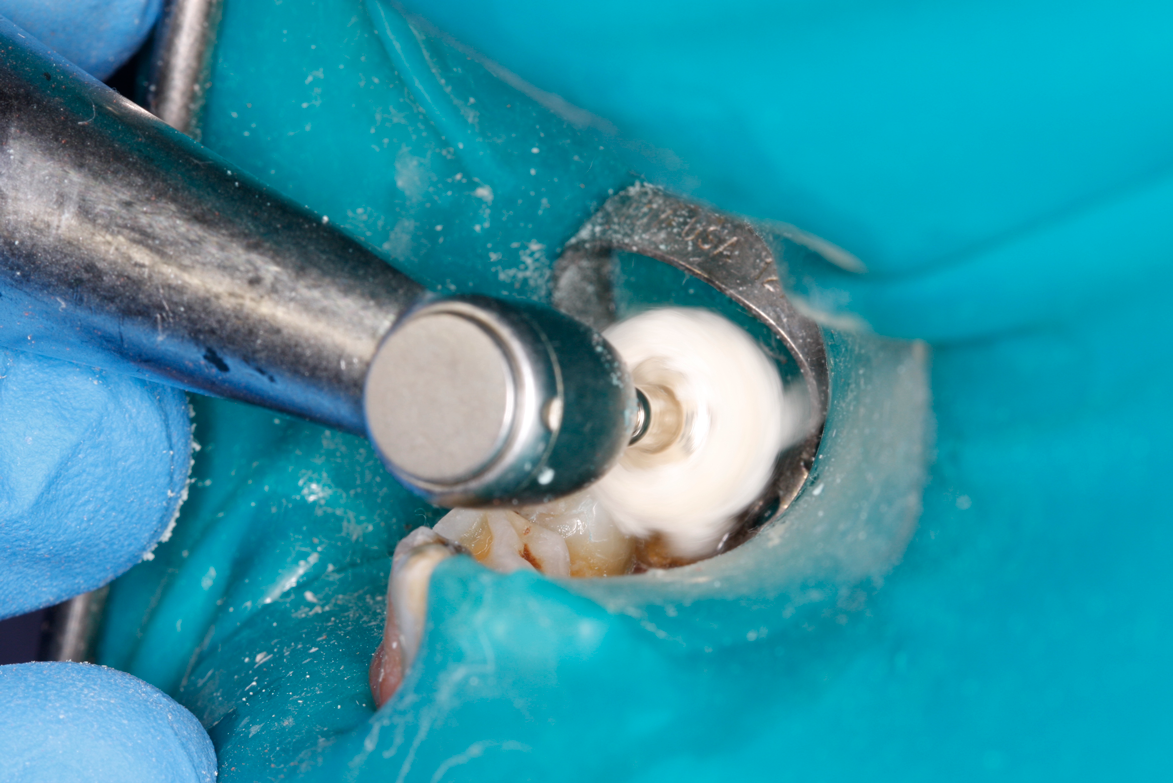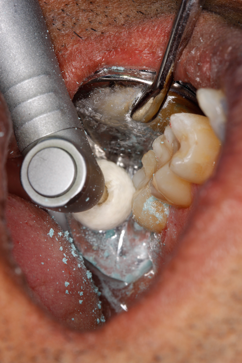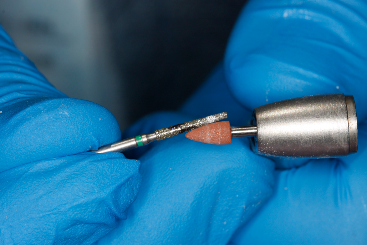 Respecting the inverse square law, the resident doubled the light-curing time to ensure good adhesive polymerization in the deep box. To facilitate the matrix band providing deep access (Paraband, Practicon; alternatively: Greater Curve matrix band; Greater Curve), the clinicians needed to remove the dam. Assurance of a dry field was accomplished by placement of bilateral dry angles that stem saliva flow from Stensen's ducts. A swedopter device was placed under the tongue to suction saliva from the sublingual and submandibular glands. Figure 17 shows the gingival area closure accomplished with the Paraband "Elizabethan collar effect"; no wedging is possible, so this Tofflemire type band provides a tight gingival seal by virtue of the band's unusual geometry. In Figure 18, the comfort of injection of the dual- cured bulk-fill flowable utilizing the bendable 20-gauge needle can be noted; it would not be possible to fill this with a paste-type universal composite. Subsequent to a 90-second self-cure phase during which the surface cannot be disturbed, the resident placed starting pits in the mesial central and distal pit areas with the medium acorn of the Occlusinator PRO bur system (StraussUSA; alternatively: R.A.P.T.O.R. Acorn, Henry Schein) (Fig- ure 19). Figure 20 shows the pits created at uniform depth facilitated by the limit stops on the burs. The acorn now is moved in a pit-to-pit pattern that created the planes that form the triangular and oblique ridges as well as the marginal ridges (Figure 21). After the planes were formed, a X-mas tree-shaped diamond bur was used to refine and prepolish the planes formed by the acorn (Figure 22). Refinements such as secondary anatomy can be placed using the mini-acorn (Figure 23). Figure 24 shows a Brownie polisher reshaped to a straight-sided X-mas tree bur that is used to polish the planes, pits, and ridges. In Figure 25, a Greenie polisher is shown that also has been reshaped to be a straight-sided X-mas tree polisher. Both are used at 50,000 to 100,000 rpm and with a copious water spray. Final polish is accomplished with a latch bristle brush coated with TopDotz polishers (Dental Ventures of America; alternatively: Shammy Bright™ Composite Polishing Paste, Kerr Dental) (Figure 26). As shown in Figure 27, the pure diamond comes in pellet form to facilitate good asepsis. The last polish is applied with a dry latch-type cotton buff (Figure 28). In Figure 29, note the anatomy formed by this technique. It is apparent that this resident accomplished a more than satisfactory result, as evidenced by the post-treatment radiograph (Figure 11).