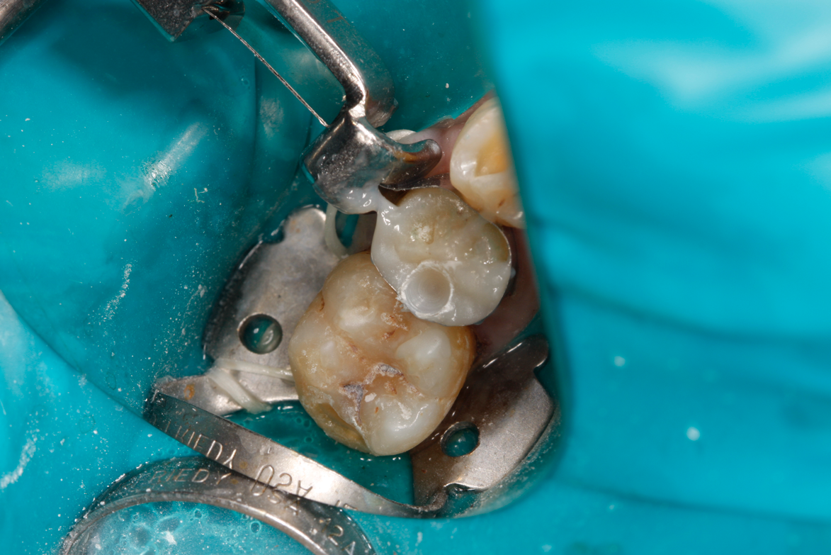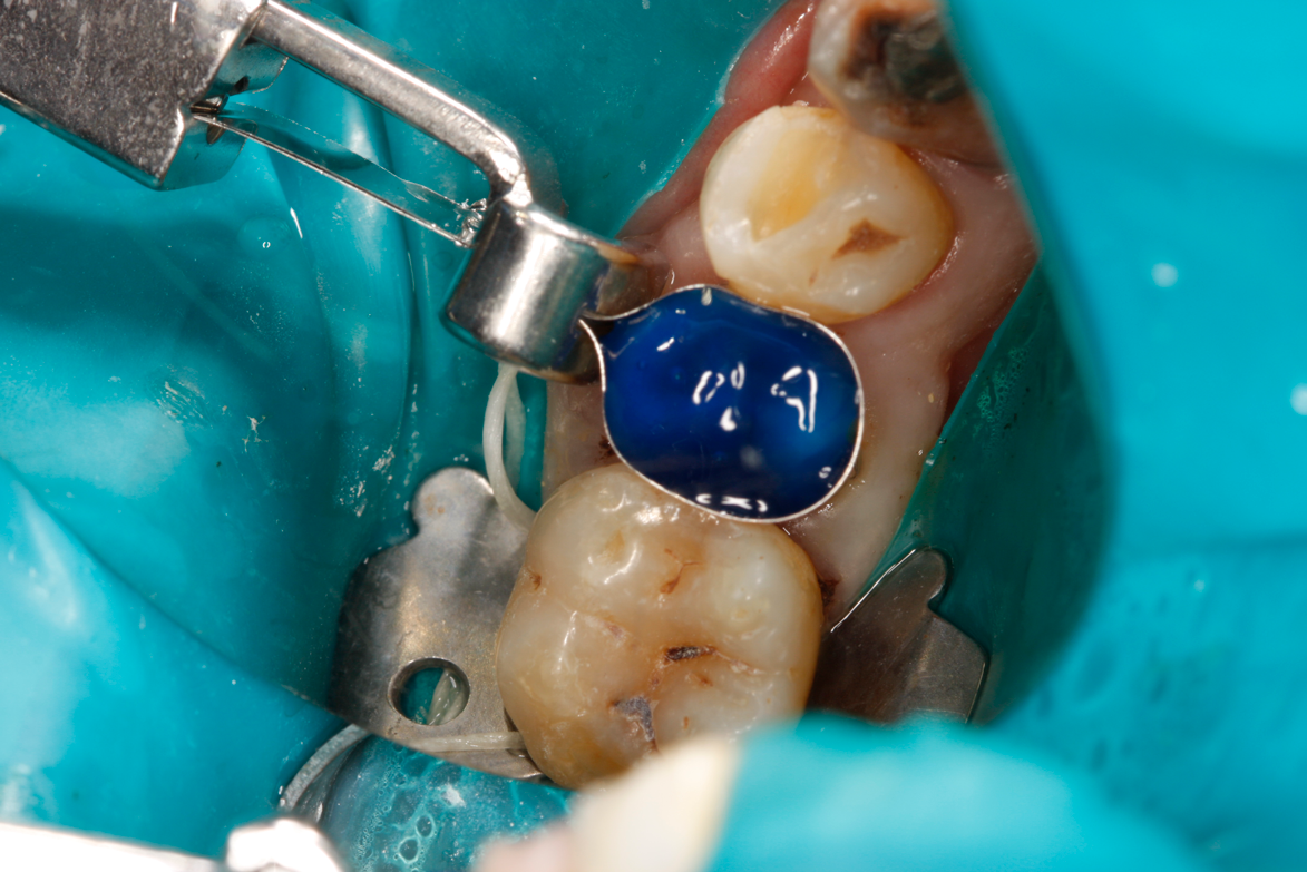 When applying the dual-cured bulk-fill composite, a slight overfill of the cavity prep is important, as stress relief of bonded walls and pulpal floor occurs at the expense of the nonbonded occlusal surface. Auto- and dual-cured composites can be used to mitigate polymer stress in high C-factor restorations and thus prevent pain from pulpal floor gapping postoperatively as well as recurrent caries due to micro-gapping at margins. Dual-cured flowable composites have limited ability to hold a matrix band closely apposed to an adjacent tooth. Consequently, it is critical in developing tight proximal contacts to wedge the teeth prior to preparation of the cavity. This is called prewedging (depicted in Figure 5). Another important consideration is the type of ring, wedge, and matrix employed. The wedge must close off the base of the well-fitting matrix band to prevent overhangs. The separation force of the ring is critical to ensure a good contact with the adjacent tooth. Nate Lawson at UAB found that 28 N was the best measured by Instron, while other researchers claim that 8 pounds measured by removal of ring with forceps is the optimal separation force. Another consideration in selection of the ring and wedge is the amount of separation force generated by these devices. Dr David Clark has discussed that "tack welding" the band to the buccal and lingual of the tooth with flowable composite can be accomplished by holding the band in close opposition to the adjacent tooth with either a matrix adjusting instrument (Bioclear™ Push-Pull, Bioclear Matrix Systems) or contact-forming instrument (Contact Pro, CEJ Dental) (alternatively: Perform Contact Former, Practicon Dental) (David Clark, DDS, personal communication, December 7, 2022). This does involve using an assistant to light-cure the tack weld; however, it is guaranteed to generate a tight contact (Figure 6 and Figure 7).