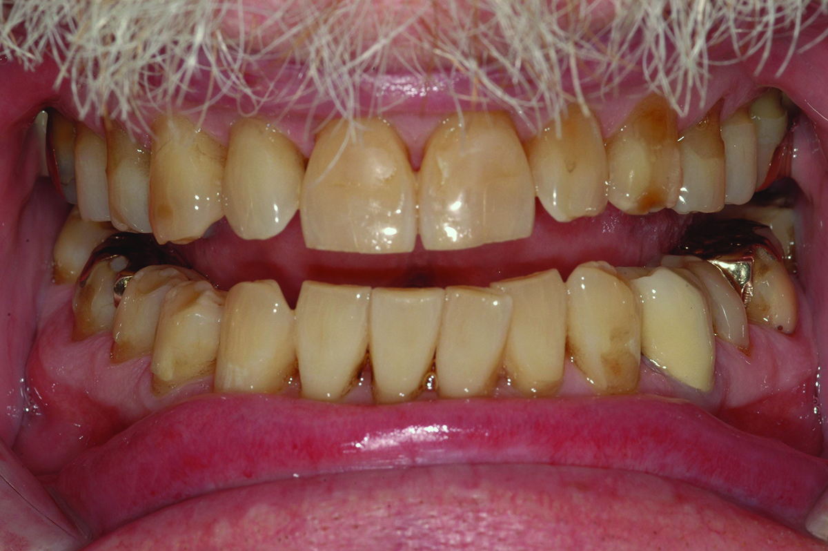 The serious consequences of awake bruxism (clenching) and GERD on a middle-aged dentition were quite apparent in this case. A 69-year-old man had originally presented to the office in 2009 for a comprehensive examination but did not immediately return for treatment. He returned 8 years later with the chief concerns of pain in his mandibular left molar (tooth