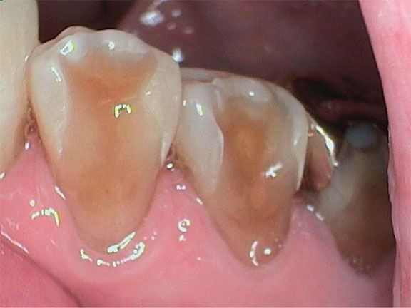 No. 18 (Figure 6 and Figure 7). The occlusal resins were lost on the mandibular molars, and the erosion and abrasion from the opposing crowns continued to erode the tooth structure.
