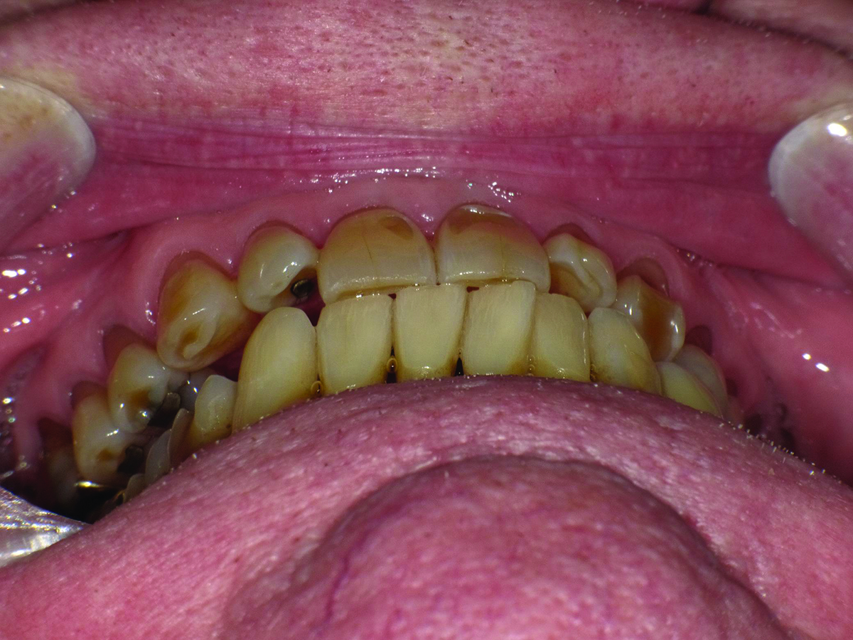 The dental history included fear of dental treatment, a history of broken and/or chipped teeth, toothaches (No. 18) and/or cracked fillings, food trapping between his teeth, an awareness that his teeth had changed in the past 5 years, and past use of a bite plate. He was uncomfortable and self-conscious about the appearance of his teeth. He reported awareness of clenching during the daytime.
