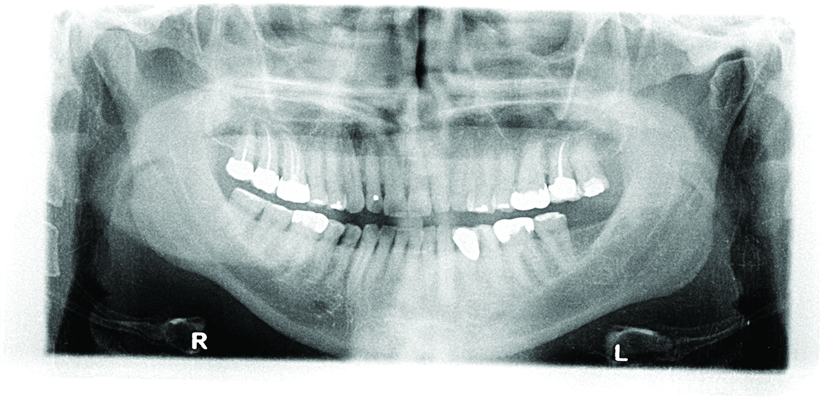 Periodontal: The periodontal examination revealed generalized clinical attachment loss but no pockets greater than 3 mm, no bleeding on probing, and no significant mobilities of any teeth. Adequate attached gingiva was present on all teeth. Home care was acceptable. Generalized tissue and bone loss was evident on the buccal surfaces of the posterior teeth. His periodontal disease was classified as stage II, generalized, grade A based on the radiographic