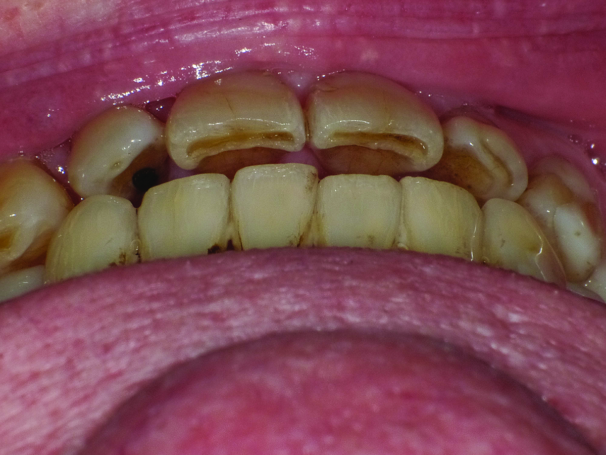 Biomechanical: Significant tooth structure loss had occurred between 2009 and 2017 (Figure 1 through Figure 3). Severe attrition had occurred on the anterior teeth, especially tooth No. 11. Severe erosion and abrasion were present on teeth Nos. 11, 18, 20, 21, 28, 29, 31, and 32 (Fig-