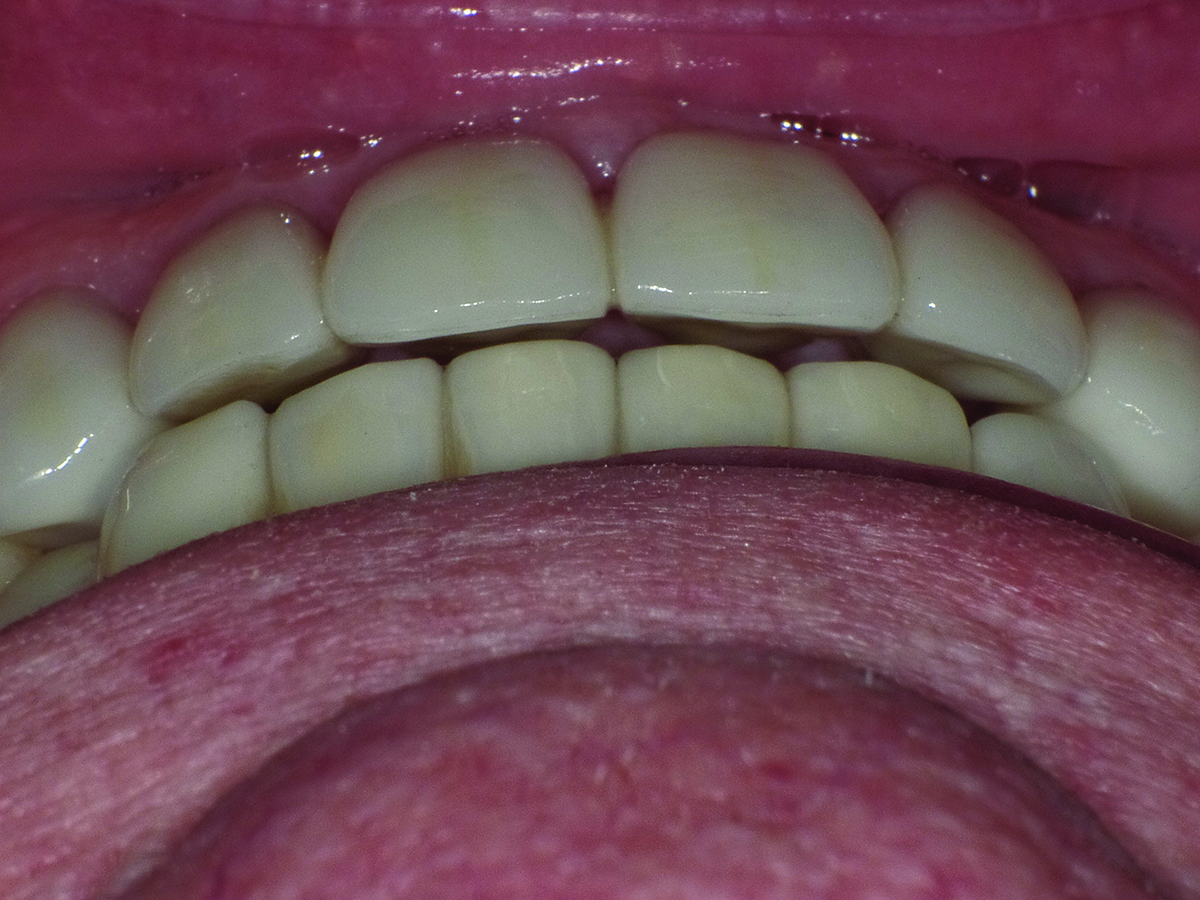 Two weeks later, the maxillary zirconia crowns were cemented with a self-adhesive universal resin cement after verifying the margins, interproximal contacts, color, and esthetics. The prepared teeth were microetched, and a single-step self-adhesive bonding agent was applied and cured. The crowns were microetched, washed, and dried. A ceramic primer was applied with a microbrush for 1 minute on each individual crown, and the aforementioned self-adhesive universal resin cement was dispensed into each crown prior to seating. Excess cement was removed.
