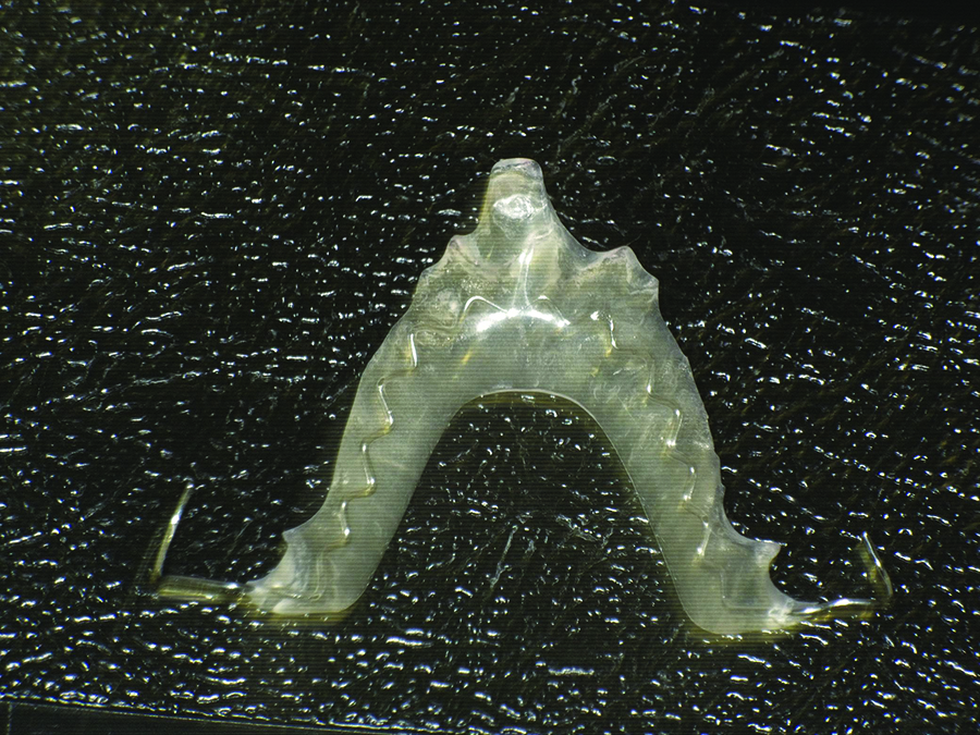 Functional: Attrition was noted on the teeth that were not protected with full-coverage crowns (Figure 8 and Figure 9). While wearing a Kois deprogrammer for about 1 month prior to restorative treatment, the mandibular teeth wore a notch in the deprogrammer platform, confirming clenching and the possibility of an impaired cortical control of the central pattern generator (Figure 10).1 All platform variables were verified and proper design of the Kois deprogrammer was followed. (The notch in the deprogrammer was repaired, leaving a smooth, flat surface to allow the proper position of the mandible to be determined.) The temporomandibular joint examination revealed normal opening with no joint sounds. The load and immobilization tests were normal. All the muscles, except the masseter, had no tenderness to palpation. Trigger points were palpable within the masseter muscles, which were hypertrophied. The diagnosis was determined to be occlusal dysfunction with the addition of awake bruxism and clenching. Upon questioning, the patient shared that he clenched while playing tennis daily, which he was very passionate about. The evidence that he was not grinding at night was the fact that tooth No. 11 was extremely cupped and not flattened. This ruled out a diagnosis of sleep bruxism, as the incisal edge would have become flat due to lateral movements of the mandible.