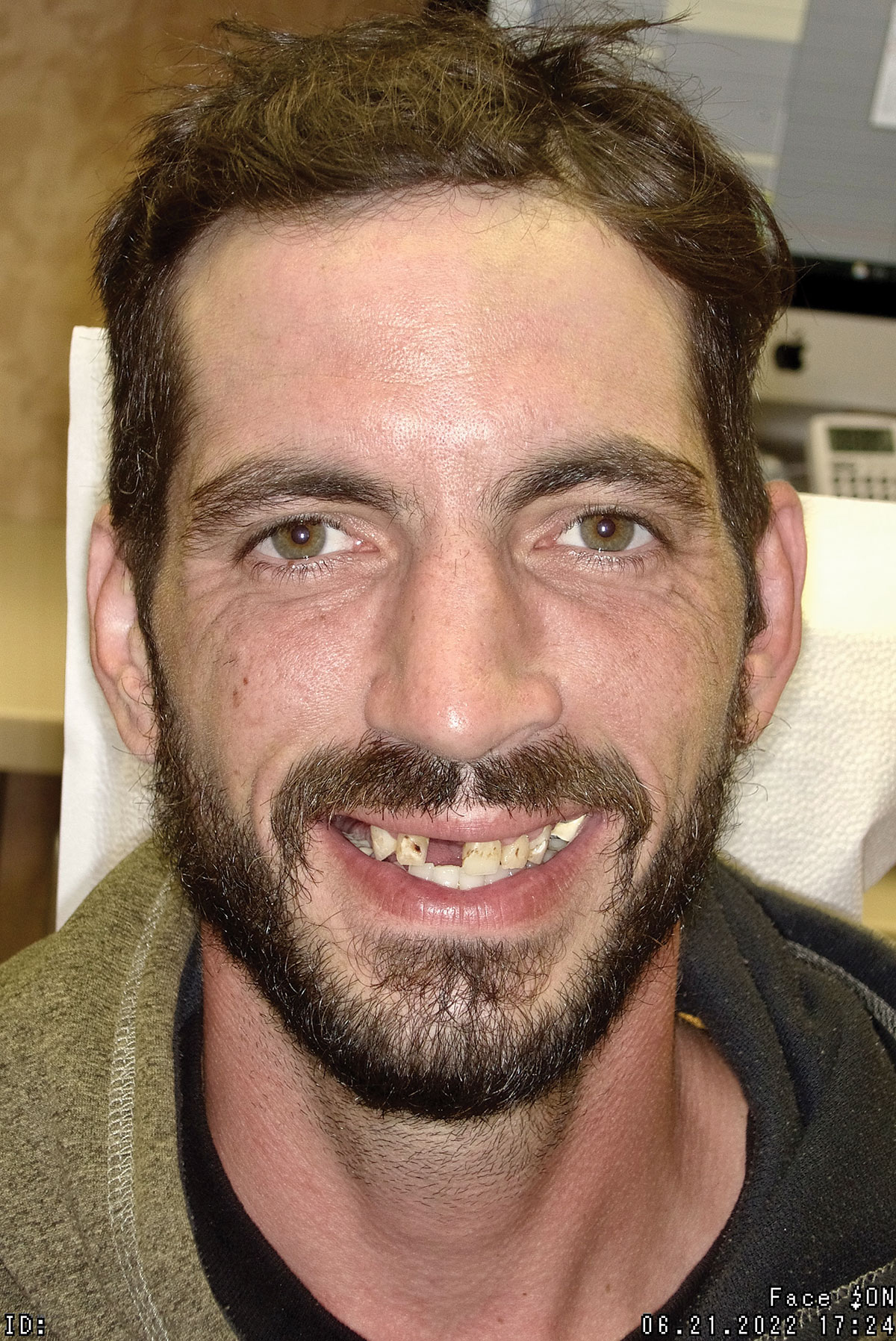 At the initial appointment, a panoramic x-ray and periapical x-rays were taken. As part of the protocol, photographs of the patient from head to shoulders were taken and scans of the teeth and soft tissue were captured with an intra-