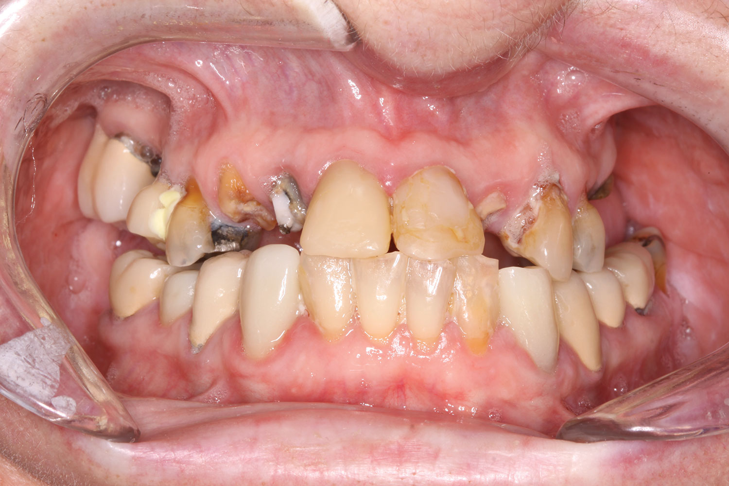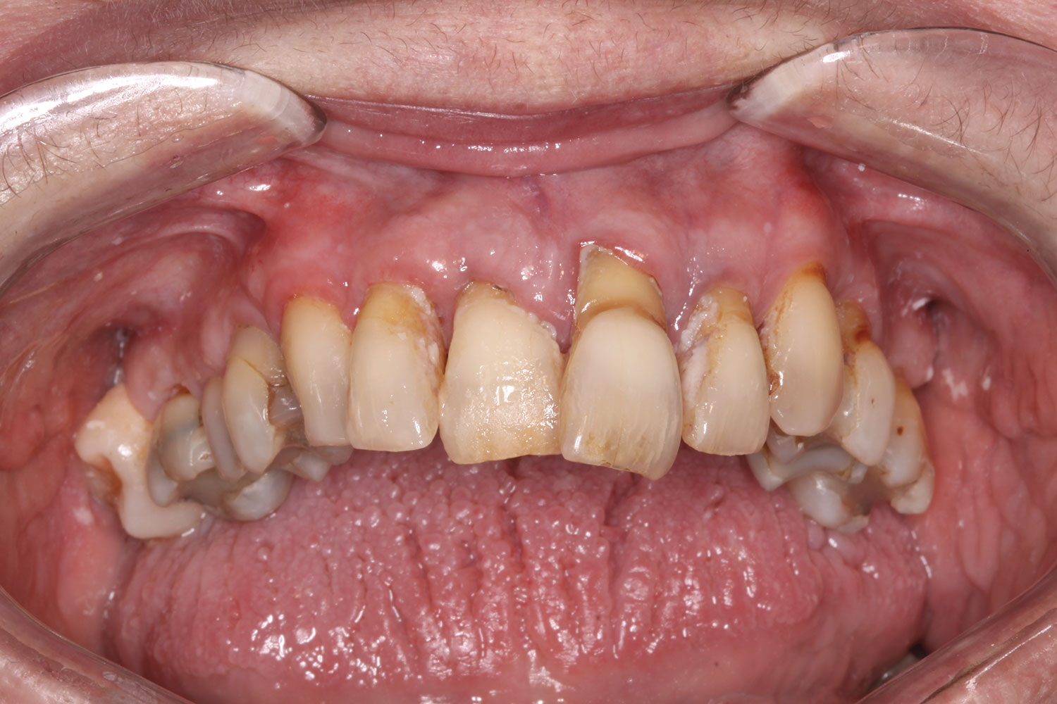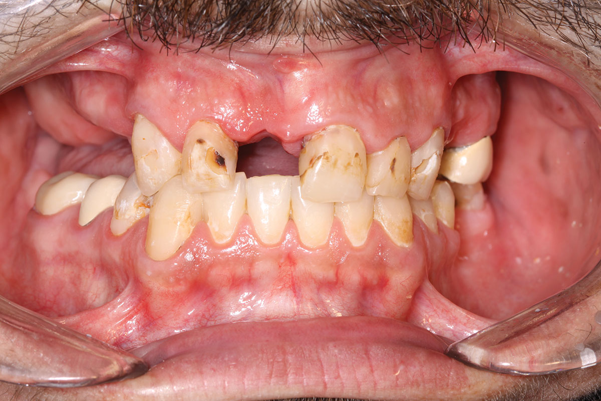 A 36-year-old male patient presented with a highly compromised maxillary dentition comprised of only teeth Nos. 4, 6, 7, 9, 10, 11, and 14 (Figure 1 and Figure 2). This poor condition was the result of only sporadic dental care with extractions and no teeth replacements. Soft tissues had normal contour, and bone profiles were generally sustained and favorable. The patient was excited about having the option to transform his compromised esthetics and function in one visit.