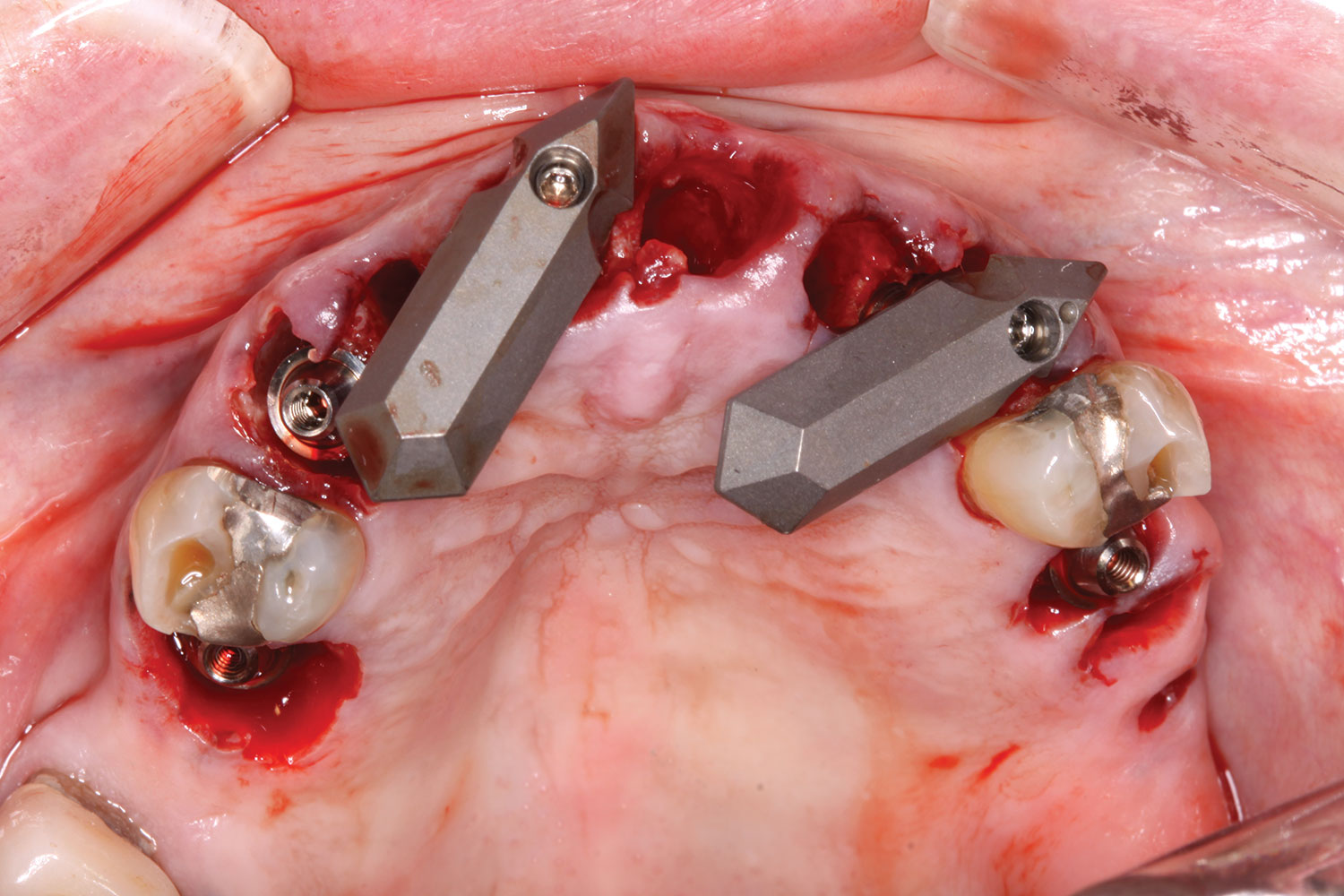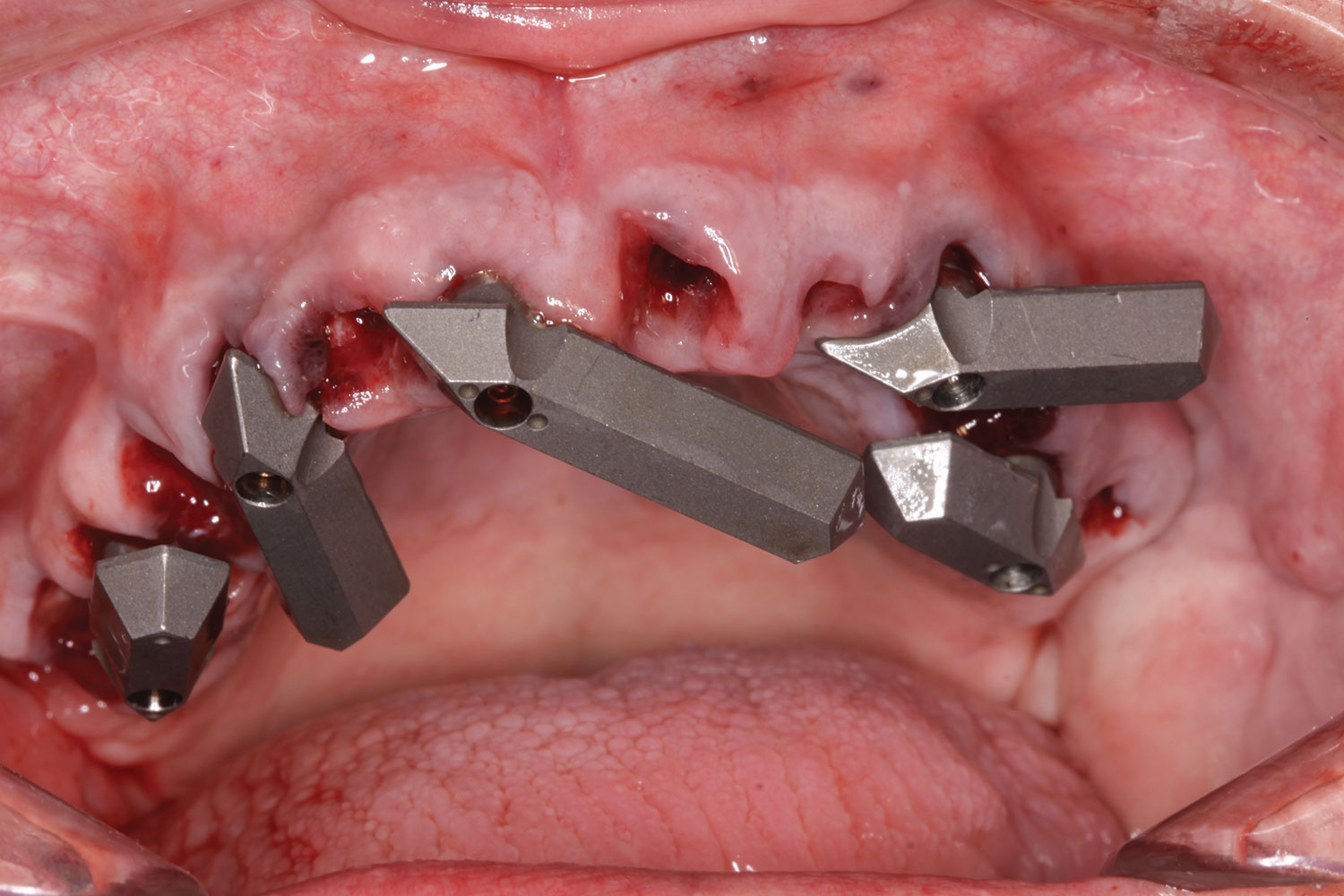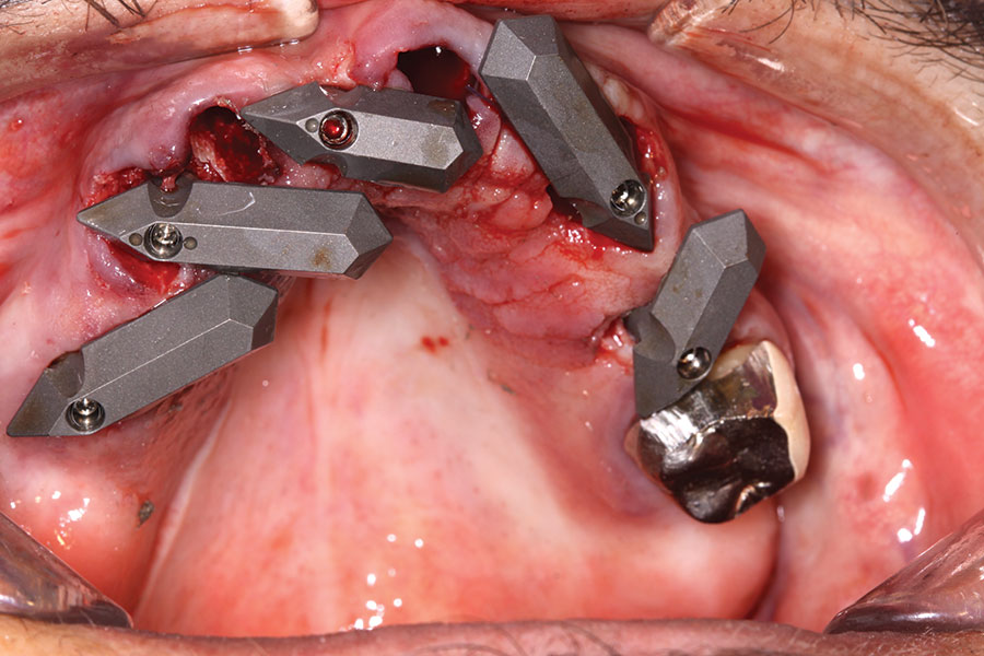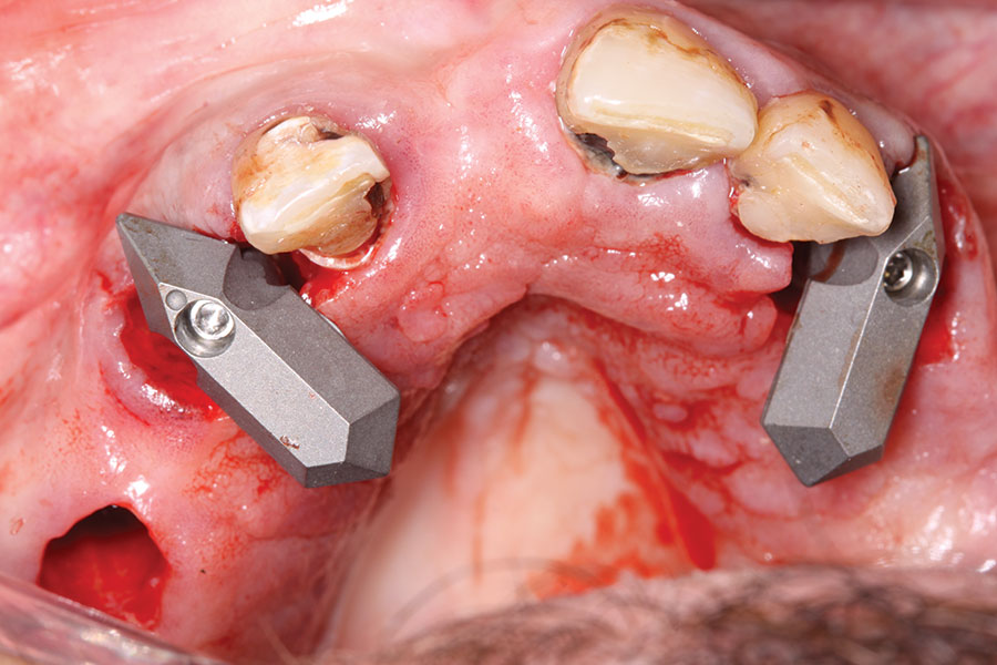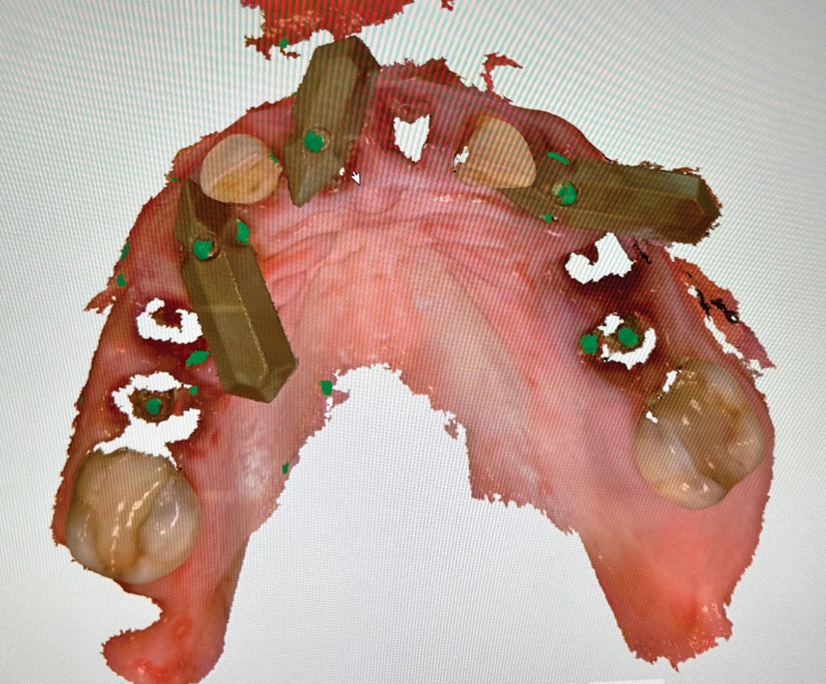 At the following visit, the patient was anesthetized with xylocaine with 1:100,000 epinephrine. Teeth Nos. 4, 6, and 11 were extracted, and immediate implants with multi-unit abutments were placed prosthetically correctly with favorable insertion torques in sites Nos. 6 and 11 (Figure 3). Scan gauges were attached to the multi-unit abutments, and a scan was taken to capture the location of the implants with a reference to the remaining teeth with capture of the soft tissues.