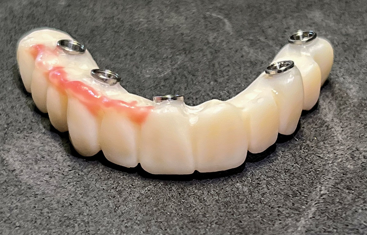 The implant company then returned an STL design file electronically via email. The office staff sent this file to the practice's 3D printer, and the appropriate color nanoceramic resin was used to print the prosthesis at 100 microns. Next, metal titanium (ti)-base cylinders, made specifically for the multi-unit abutments, were inserted into the prosthesis, which was then stained and glazed, and gingival color was applied to establish optimum esthetics (Figure 5).