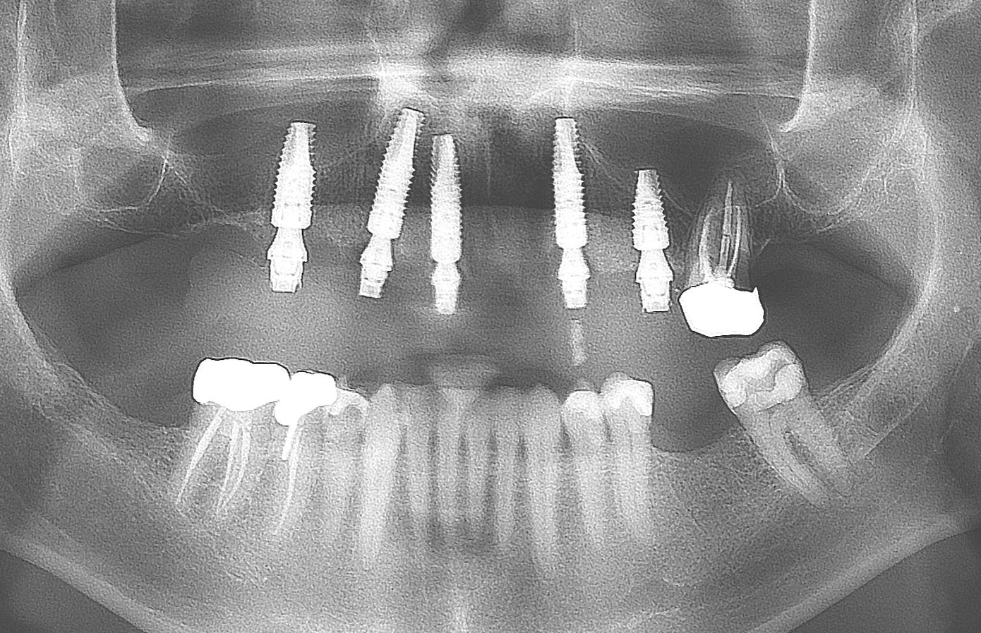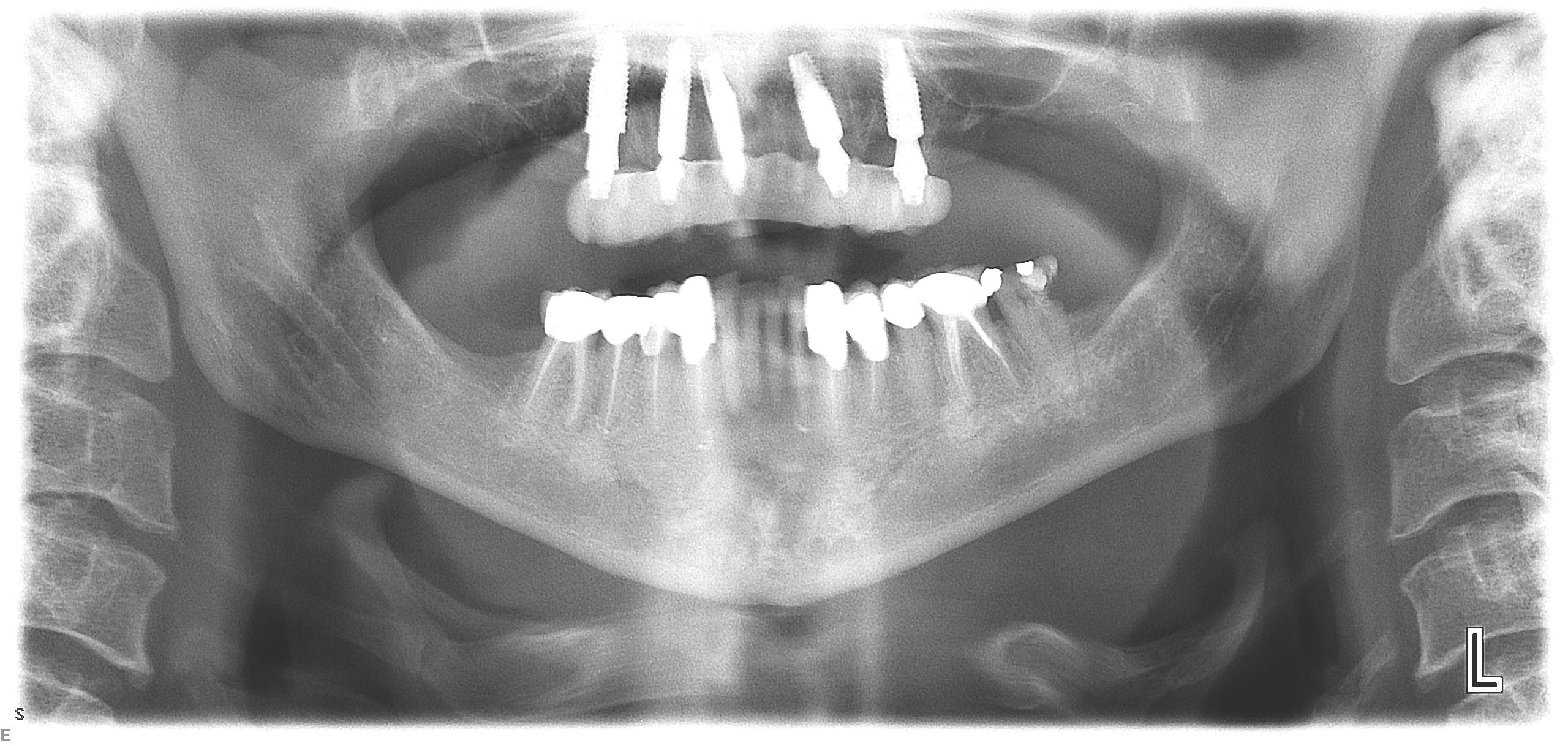 The treatment began by addressing the patient's immediate concern, which was her mandibular situation. Her mandibular teeth were extracted, and immediate implants were placed and immediately provisionalized using a screw-retained PMMA provisional, which sat on multi-unit abutments.