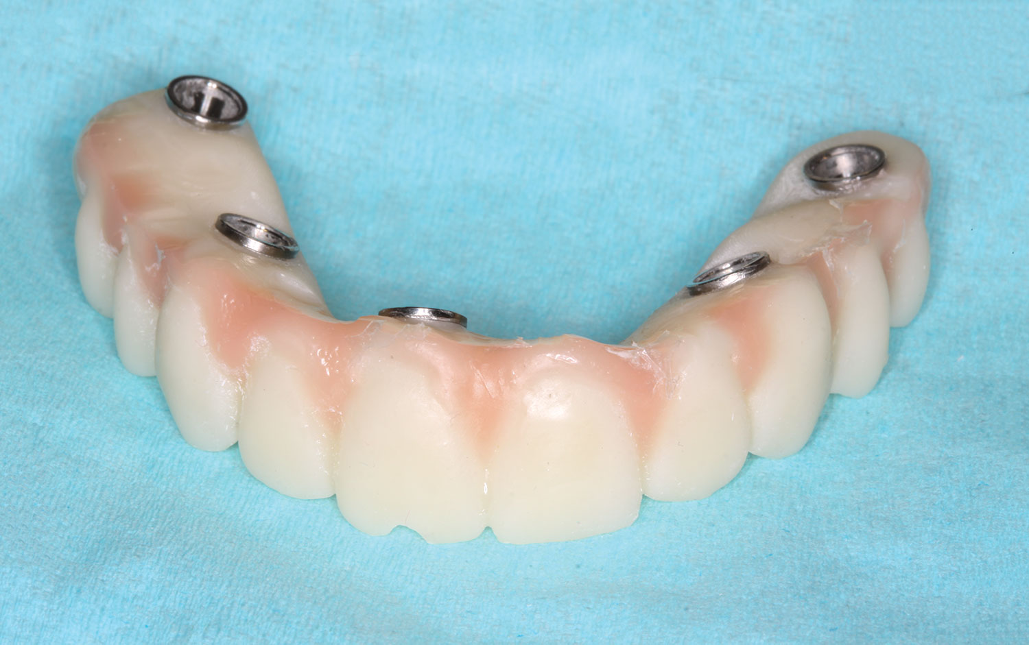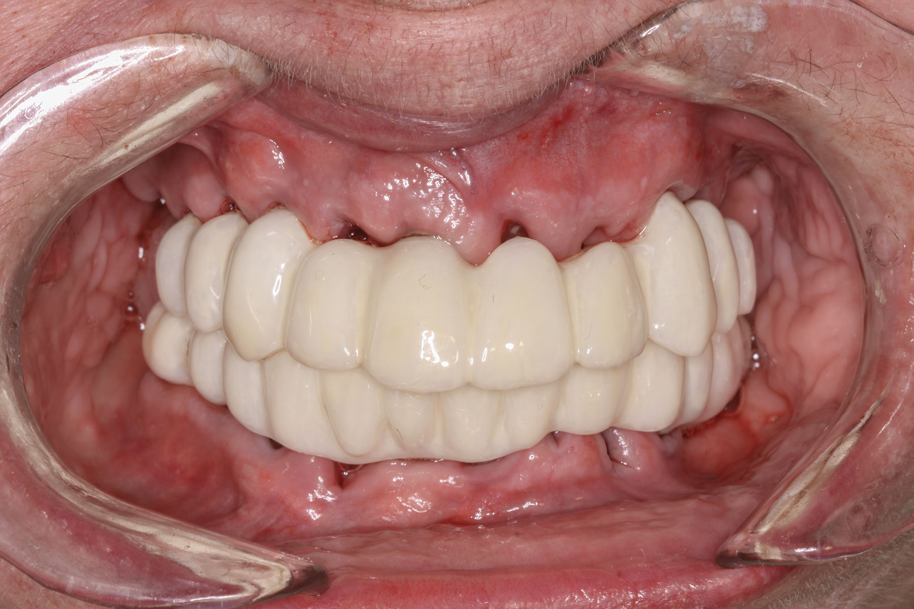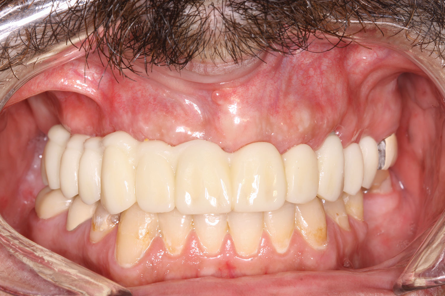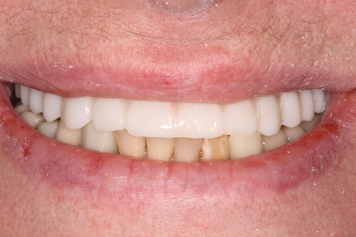 The completed prosthesis was then screwed directly onto the multi-unit abutments with Rosen screws with no ti-bases and torqued to 20 Ncm. Screw-access holes were filled, and no occlusal adjustment was necessary. The fit of the prosthesis was precise and stable and the phonetics of the patient was ideal. The patient was overwhelmed by the significant esthetic improvement with this set of teeth in place.