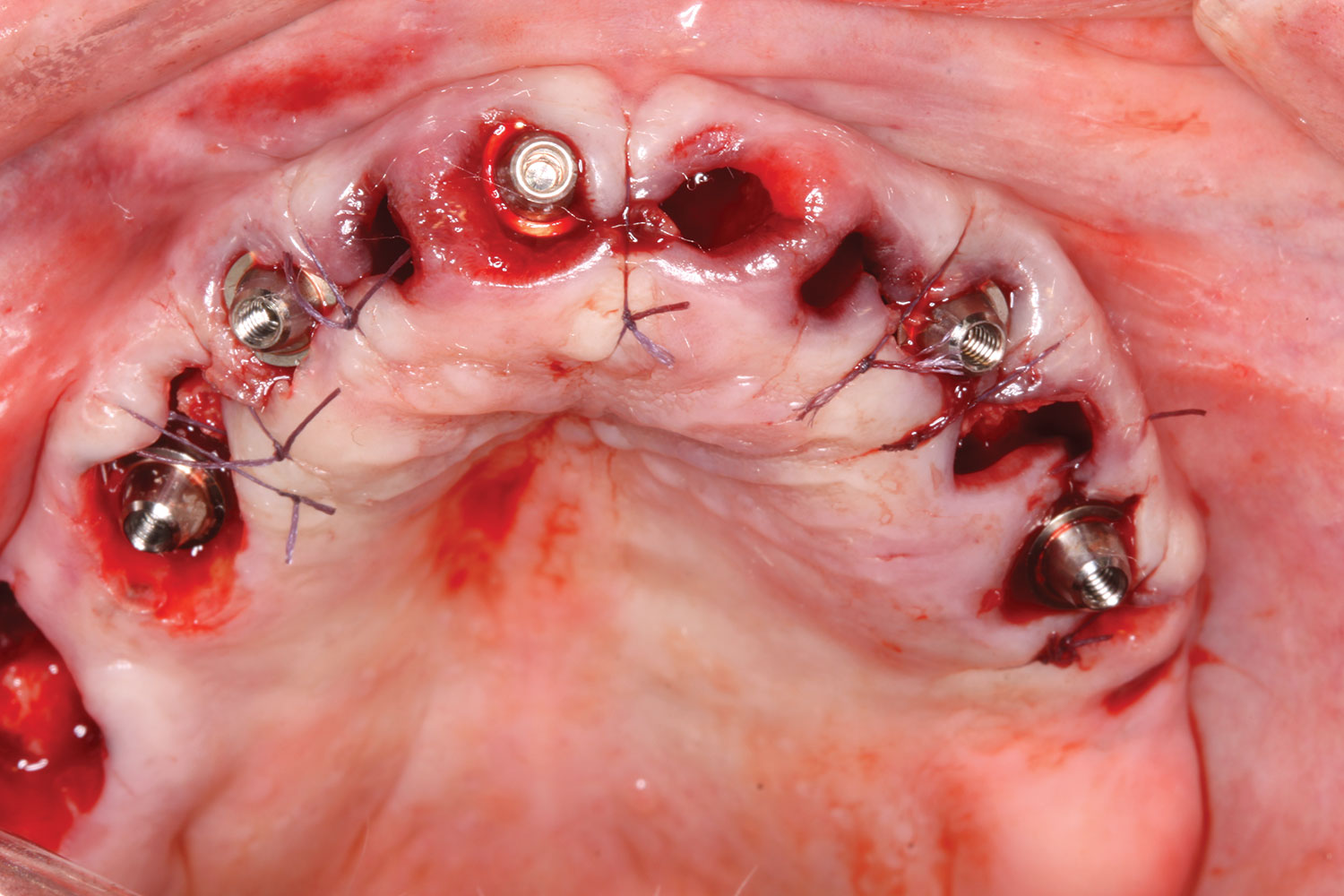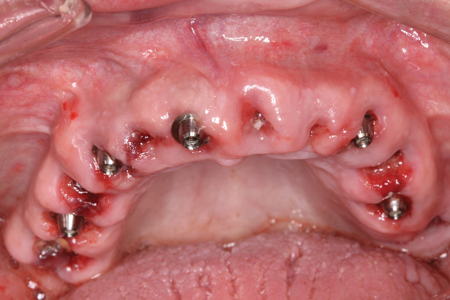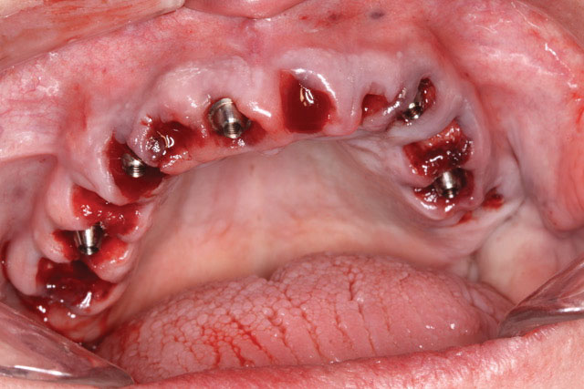 A week later the patient presented for surgery for extraction and replacement of her existing maxillary dentition with implants and a screw-retained provisional implant restoration. Teeth Nos. 2, 4, and 6 through 11, 13, and 14 were carefully extracted with attention paid to retaining site dimensions. Immediate implants were inserted into sites Nos. 4, 6, 8, 11, and 13 with high insertion torques in excess of