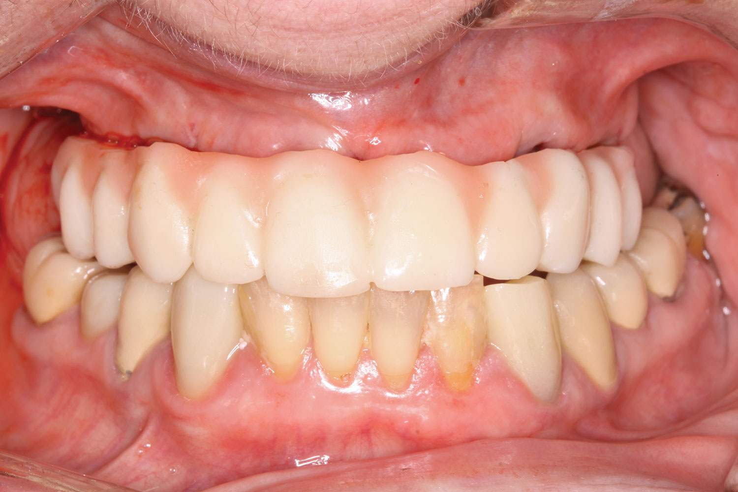 The completed provisional prosthesis was then screwed onto the multi-unit abutments with titanium screws and torqued to 20 Ncm. Screw-access holes were filled, and no occlusal adjustment was necessary. The fit of the prosthesis was precise and stable, and the patient's phonetics were ideal. The patient was overwhelmed by the significant esthetic improvement with this set of teeth in place (Figure 6 through Figure 8).