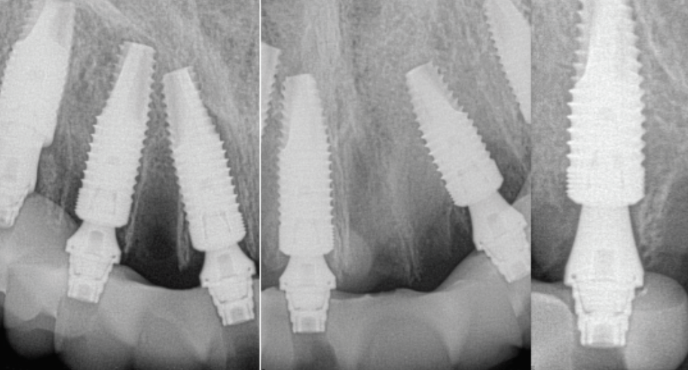 Subsequently, teeth Nos. 7, 9, and 10 were carefully extracted with retention of tooth No. 14 to maintain vertical dimension of occlusion with opposing tooth No. 19. An immediate implant with a multi-unit abutment was placed in site No. 4, and additional implants with multi-unit abutments were placed in sites Nos. 8 and 13. All multi-unit abutments were torqued to 30 Ncm.
