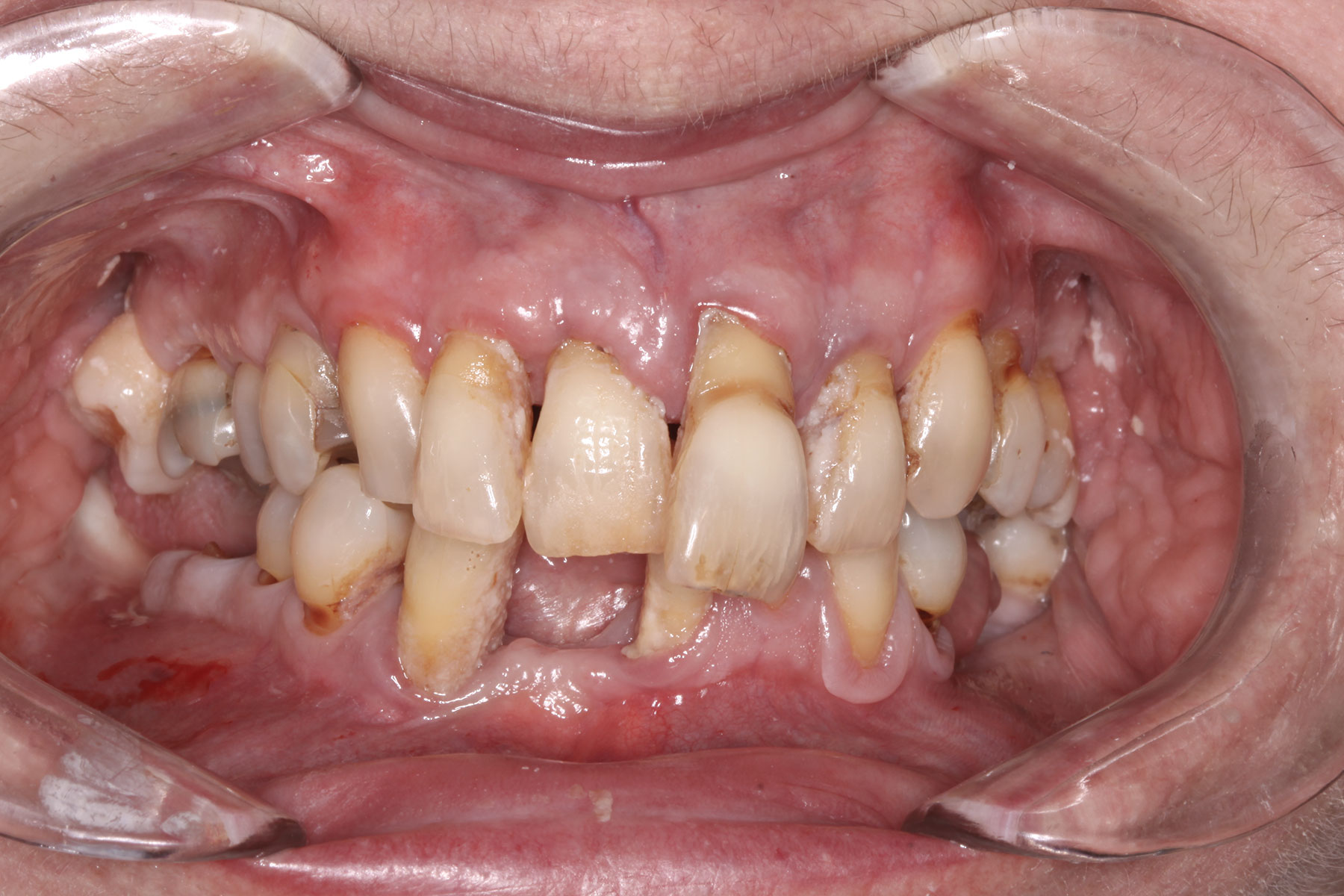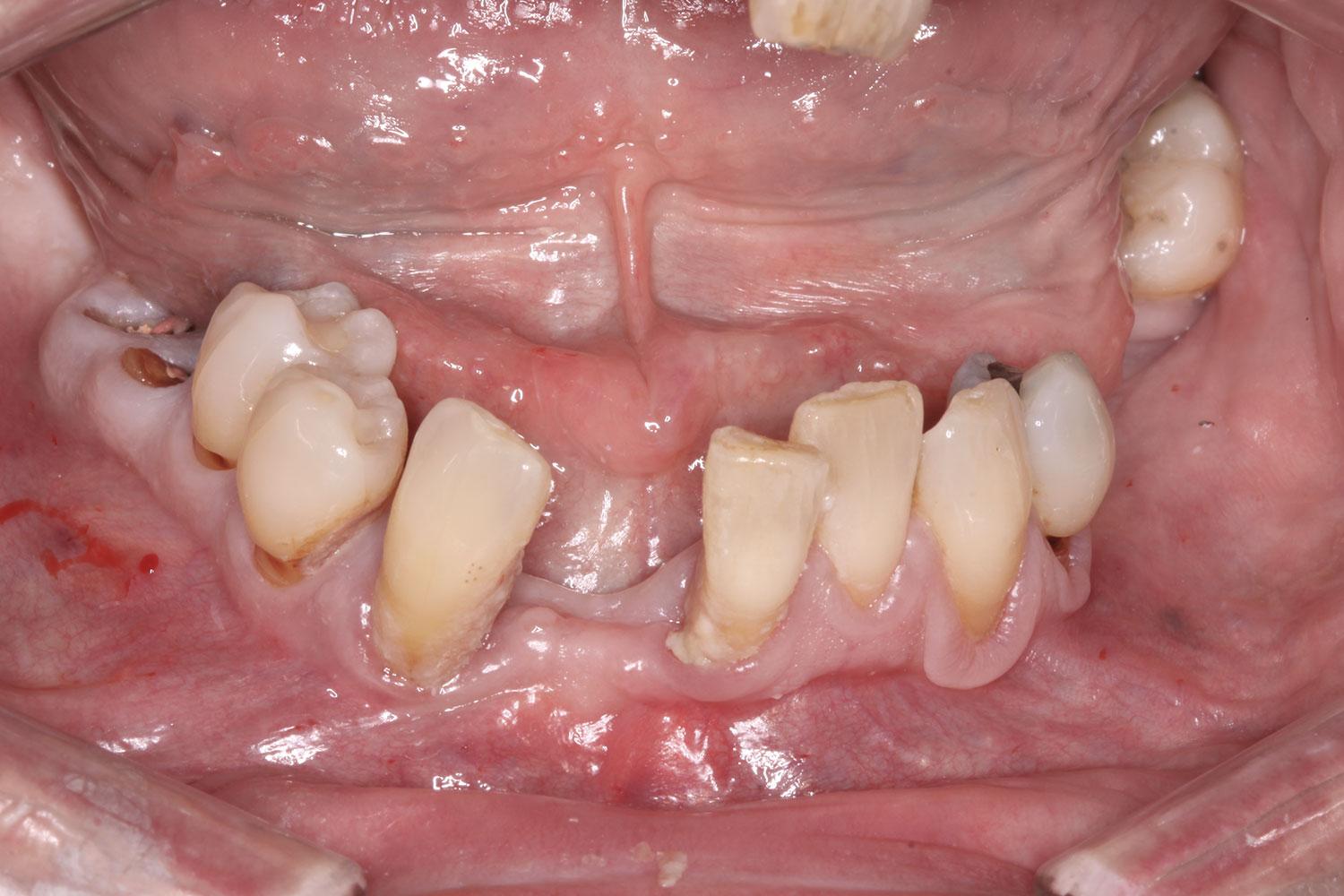 A 71-year-old female patient presented with a maxillary complete denture and a failing mandibular dentition. The patient wore an ill-fitting mandibular acrylic removeable partial denture to supplement her periodontally compromised mandibular teeth. She expressed a desire to improve the esthetics and function of her teeth and to replace her removeable partial denture with a fixed prosthesis. (Case 4 is depicted in Figure 43 through Figure 52.)