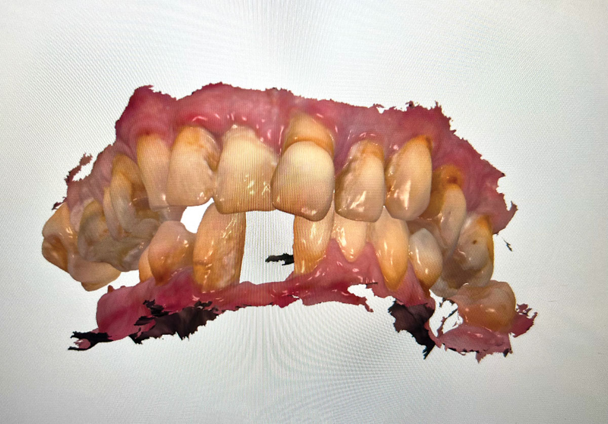 The patient's mandibular temporary restoration was then removed from her mouth. A scan was taken of the mandibular multi-unit abutments and the surrounding soft tissue. Only the fixed soft tissue needed to be recorded, as only fixed tissue is repeatable. This type of intraoral scan is also known as the emergence profile scan.