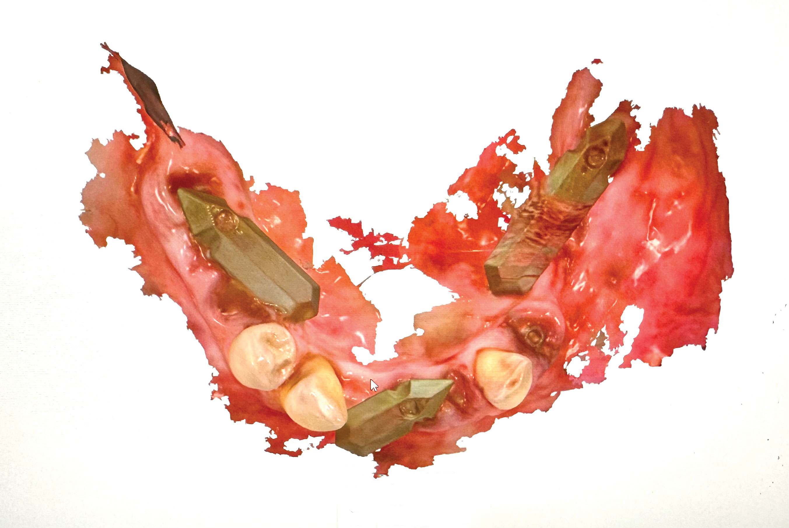 The scan gauges were then placed onto the mandibular multi-units in the patient's mouth and retained with multi-unit screws. The choice of scan gauge height and lengths was per the fully digital restorative protocol. Two intraoral scan gauge scans were taken. The first was done in a right to left pass over the scan gauges, with care exercised to move forward in an arc so as not to go back over already-scanned segments. A second independent scan was done in a left to right arc, again with care taken not to scan any segment twice in the same scan. This completed the series of intraoral scans required to produce the restoration.