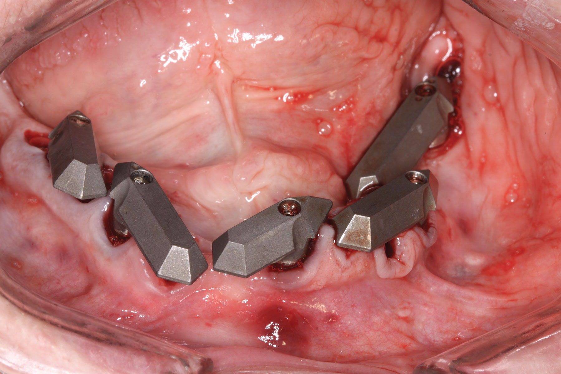 Scan gauges were then attached to the multi-unit abutments on the remaining implants so that all the implants were now in place with scan gauges (Figure 4). A scan was taken to capture all of the implants and surrounding soft tissue. The scanning protocol calls for scanning left to right, and then a separate scan right to left. These files were then sent electronically to the proprietary web portal.