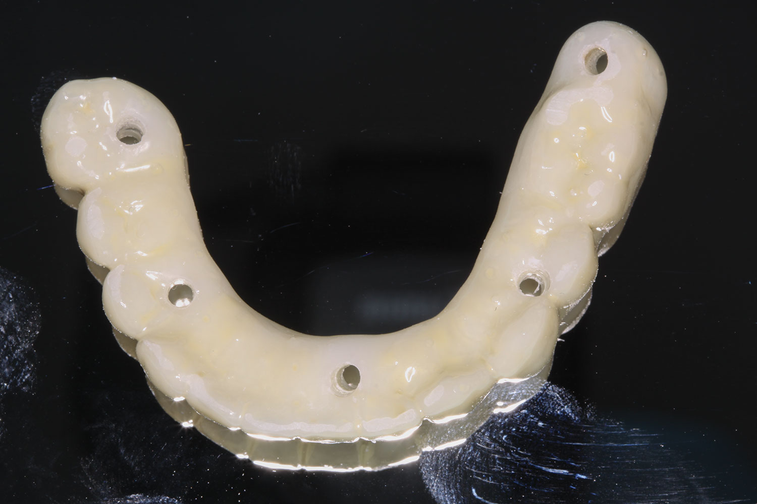 Two weeks after design approval was given, the dental office received the final prosthesis. Included in the packaging were the final prosthesis, new multi-unit screws, oral hygiene aids appropriate for patient use with this type of prosthesis, and a warranty card.