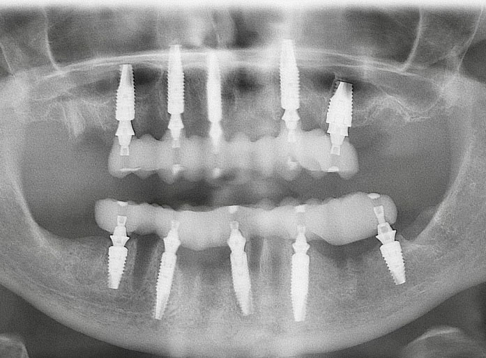 At the completion of surgery for the mandibular arch, teeth Nos. 17, 21 through 24, and 27 through 30 had been carefully extracted. Immediate implants with multi-unit abutments were placed in sites Nos. 21, 24, 28, and 30, and an additional implant with a multi-unit abutment was placed in site No. 18. All multi-unit abutments were torqued to 30 Ncm. In the maxillary arch, at the completion of surgery, teeth Nos. 2 through 15 had been carefully extracted. Immediate implants with multi-unit abutments were placed in sites Nos. 4, 6, 8, 11, and 13, and all multi-unit abutments were torqued to 30 Ncm.