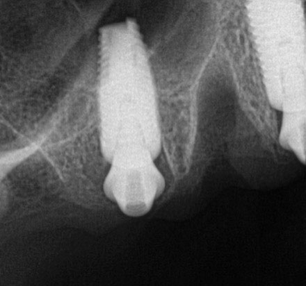 When the patient presented for insertion of the final prosthesis, the provisional prosthesis was removed and the final prosthesis was inserted onto the multi-unit abutments. One multi-unit screw was placed with hand-tightening in the most distal position on the patient's left side. Periapical radiographs were taken paralleling the multi-unit abutment to the final prosthesis joint to confirm complete passive seating of the restoration. After confirming that the restoration sat passively and completely on the multi-unit abutments, the remainder of the multi-unit screws were inserted, and all were torqued to 20 Ncm using a torque driver. The occlusion was then evaluated; this included checking centric contact points as well as for lateral excursive and protrusive guidance.