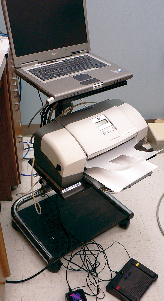 The controlled-force probe that has achieved the most widespread use is the Florida Probe® (Florida Probe Corp, Gainesville, FL) (Figure 5A and Figure 5B). This computerlinked device has in vitro resolution of 0.1 mm and is capable of recording probing depths and relative attachment levels.25-31 Clinical measurements obtained with conventional manual probes are consistently greater than those obtained with controlled-force probes.24,32-37 One of the possible reasons for this is reduced tactile sensitivity associated with the use of controlled-force probes. This is especially true in patients with untreated periodontitis for whom the presence of subgingival calculus can interfere with probe insertion. With conventional probes, it generally is easier for the operator to manipulate the probe tip past subgingival calculus deposits. A definite advantage of computerlinked probes is that they can record probe readings automatically. Some systems allow voice-activated data entry.38 The usefulness of controlled-force probes in day-to-day clinical practice has not yet been demonstrated.9
