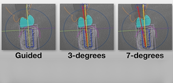 In terms of the clinical relevance of guided surgery, a meta- analysis by Abdelhay et al found that implant failure rates were three times higher with freehand surgery than with guided surgery (6.42% versus 2.25%).5 Figure 2 shows dynamic navigation versus freehand surgery in terms of their different measures. The left-hand panel shows the guided surgery optimal plan; the middle panel shows the expected and acceptable 3° of angular deviation that is achieved using dynamic navigation, with the screw access hole still in the middle of the implant, whereas the right-hand panel shows an expected and unacceptable 7° of deviation using freehand surgery-in many cases bringing the screw access hole right out through a cusp.35