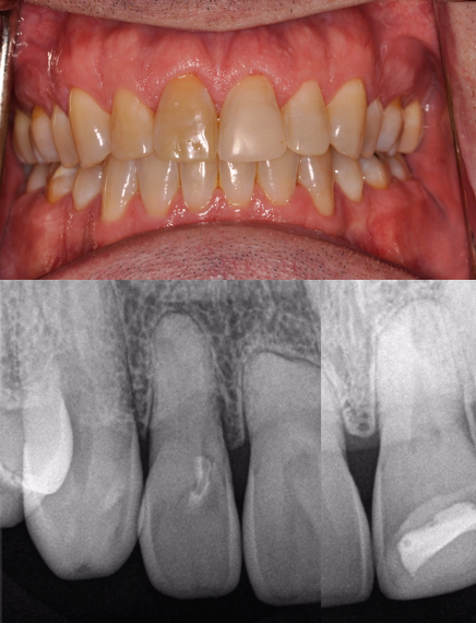 Figure 26 shows a full-arch classic "All-on-X" case at presentation. The patient was a 66-year-old male with a mutilated dentition. The patient had lost vertical dimension and desired a fixed restoration. Options were discussed with the patient, including dentures, which the patient refused long term. The patient instead agreed to a plan to undergo extractions of his remaining dentition and have an immediate maxillary denture with five mandibular implants and an immediate mandibular hybrid denture. The practitioner worked with a laboratory that could provide a monolithic PMMA digitally milled denture. Two months following implant treatment of the mandibular arch, the patient had six maxillary implants placed with immediate denture conversion.