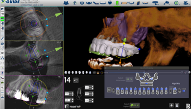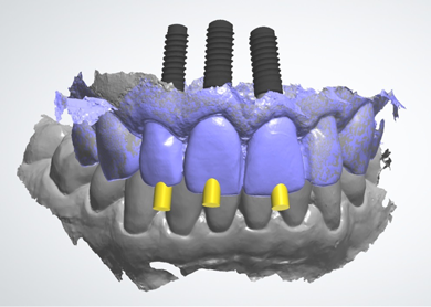 Figure 14 through Figure 18 show a partially dentate patient for whom a fully digital workflow was utilized. This 47-year-old male presented with root blunting and mobility of teeth Nos. 7, 8, and 9 (Figure 14). A thermoplastic clip was attached during the CBCT, and an intraoral scan was taken and superimposed on the CBCT. The case was then planned in the navigation planning software (Figure 15). Once the teeth were extracted, intraoral scanning was performed. The intraoral scan was imported into lab software (Figure 16), and a PMMA milled screw-retained prosthesis was fabricated. The prosthesis was placed the next morning (Figure 17). Two months later, a new intraoral scan was taken to capture the mature soft tissue, and the final milled titanium abutment and restoration were delivered (Figure 18).