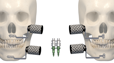 The key to performing dynamic navigational implant surgery in an edentulous patient is to have an easy way to attach the tracking device. Figure 20 shows the minimally invasive intraoral screws and arms used to hold the patient tracking array. Ideal anatomic locations are the front of the mouth; in the mandible, the symphysis region; and in the maxilla, the nasal spine and piriform rim regions, which are often sites of excellent cortical bone. These screws can be oriented either horizontally or vertically. The navigation software has virtual images of the fixation screws and arms for easy selection and visualization of the sites. For those situations requiring extraoral fixation (eg, minimal mouth opening in patients with scleroderma or other limiting factors), the inferior border of the mandible or zygomatic buttress can be planned (Figure 21).