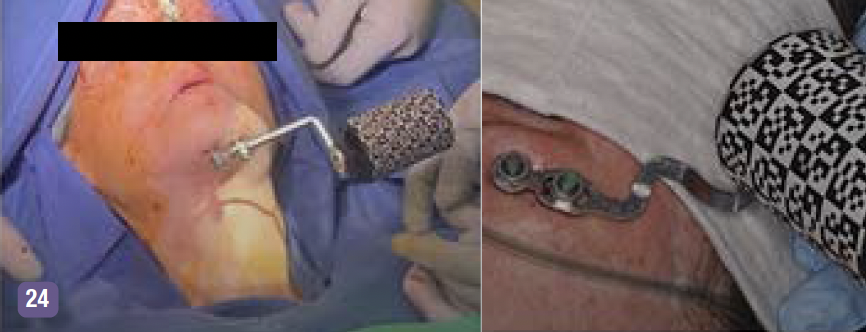 This is the only step that is unique to the full-arch or edentulous reconstruction workflow. To attach the tracking device, incision design must be planned first. Stab incisions are indicated if minimal bone reduction is planned, but if extensive bone reduction is necessary, a crestal incision should be used (Figure 23). In the maxilla, start with a vertical incision in the midline to find the nasal spine. The bone is usually dense in this area. Next, the screws are placed, the arm is placed on the shoulder of the screw, and a nut is used to tighten down the arm with a driver. Extraoral locations can be used for patients with minimal mouth opening or poor bone volume and quality. In Figure 24, the patient shown in the left-hand panel had scleroderma and could open her mouth only 10 mm to 12 mm. A stab incision was used at the inferior border of the mandible. When there is minimal mouth opening, as in this case, the patient cannot undergo implant surgery using a static guide, but can be treated with surgery guided by dynamic navigation. The patient shown in the right-hand panel of Figure 24 had traumatic maxillofacial injuries and poor-quality bone that necessitated a complete maxillary reconstruction. In this patient, a stab incision was created over the zygomatic buttress. In the author's experience, extraoral fixation is useful for patients with an extremely atrophic maxilla or who have lost ana- tomic structures secondary to resections, and for auricular implant placement. Extraoral fixation is also useful for off-label use cases, such as zygoma implants, osteotomies, and patients requiring resections and reconstructions. The author recommends the extraoral parts shown in Figure 25.