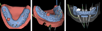 The position of the implants must be prosthetically driven. Any of the major software planning tools can be used with dynamic navi- gation. The software included with the navigation system allows for dual scan planning, as dual scan images are suitable for this prosthetically driven approach. Once the plan is completed, the data should be sent for fabrication of the provisionals. If navigation software is used for implant planning, the data can be exported as individual or linked generic .stl files, or if planning is done without the navigation software, the data can be imported into the navigation system.