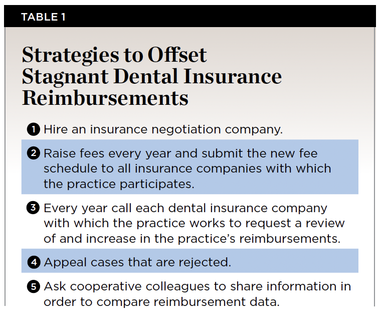This creates a different type of practice management challenge for dental practices. In most cases strategies can be employed to address this challenge that can be highly successful and help increase practice production in order to offset limits in insurance reimbursements. Some of these strategies are listed in Table 1.