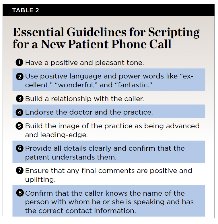 Practices often invest in marketing activity to increase the number of new patients; however, the investment may be wasted if two key factors are not in place. First, the new patient phone call is critical. When a new patient calls, well thought-out, specific scripting needs to be in place to create a sense of value, caring, and trust. These calls should be more than simply logistical and administrative in nature with the front desk person only focusing on getting the patient scheduled and recording their basic information. Guidelines for scripting for a new patient phone call are provided in Table 2. If there is a lack of preparedness for a new patient call, many of these patients might either not schedule or end up canceling or not showing up for their new patient appointment. Again, this is something that practices should measure: the percentage of new patient phone calls that do not result in an actual appointment.