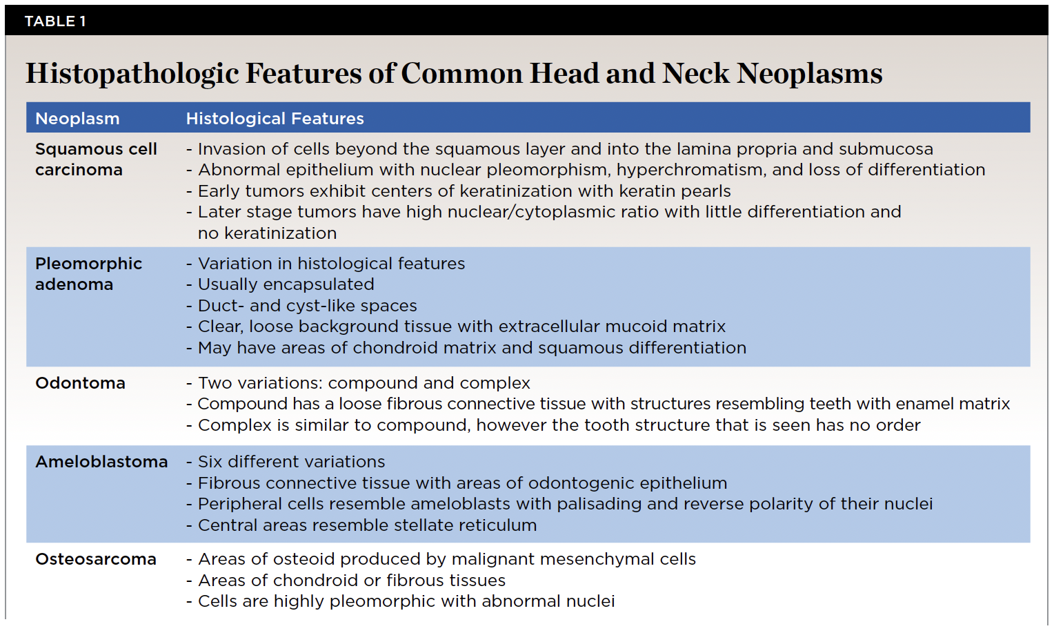 Table 1 contains various histopathologic features of common head and neck neoplasms.