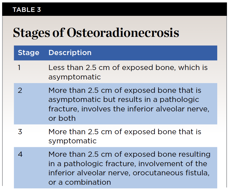 Damage to structures within the oral cavity and surrounding structures is fairly common following radiation therapy. Ulcerations may occur on the skin and mucosa. Additionally, the salivary gland is extremely radiosensitive and cell death is inevitable if it is irradiated. The patient will likely experience xerostomia resulting in difficulty eating and wearing dentures. Saliva will become thick and ropy and lose its ability to buffer acids produced by cariogenic bacteria. Therefore, patients may experience rampant decay following radiation therapy.23 The mucosa within the oral cavity can become red, inflamed, and painful, which is a condition known as mucositis, and this can result in ulceration, which subsequently can become infected. The most common location for mucositis-induced ulceration is the soft palate, although other locations are vulnerable to it as well.24 Xerostomia can exacerbate the pain caused by the mucositis. Along with the damage to the mucosa and salivary glands, blood vessels and muscles can be affected. Due to the death of muscle cells, patients may experience trismus post-radiation. Damage to blood vessels can result in loss of vitality of bone resulting in a condition known as osteoradionecrosis, defined as exposed bone through the skin or mucosa for a minimum of 3 months.25 Osteoradionecrosis is classified in stages, and as it increases in stage there is an increase in the amount of exposed bone, devitalized bone, and pathologic fractures (Table 3).26