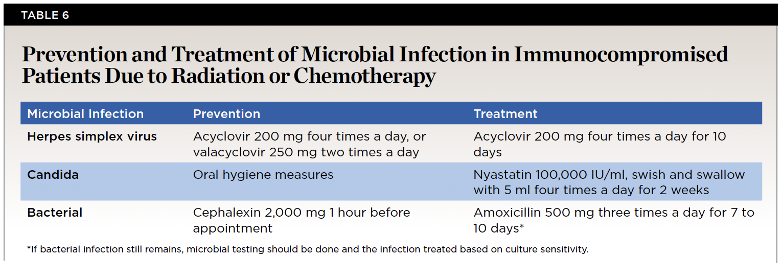 During radiation therapy, the patient must follow a meticulous oral hygiene regimen. Custom fluoride trays should be fabricated for the patient prior to radiation, as damage to salivary glands can occur during radiation treatment, predisposing the patient to caries. Fluoride trays should be used for 5 minutes on clean teeth, and the patient should not eat for 30 to 60 minutes after application. Furthermore, patients should be instructed to limit cariogenic foods and use chlorhexidine 0.12% mouthrinse to limit the amount of bacteria within the oral cavity. The purpose for meticulous oral hygiene is to prevent any caries during radiation or chemotherapy. During radiation, the patient is at risk for osteoradionecrosis if any extractions are performed, with a systematic review reporting a risk of 5.8%.32 Endodontic treatment is the preferred therapy if a tooth becomes necrotic during radiation therapy. If the tooth is nonrestorable, endodontic treatment should still be carried out followed by a coronectomy. However, if the tooth absolutely needs to be extracted, a 1-week course of pentoxifylline can be used prior to extraction followed by pre- and postoperative hyperbaric oxygen.33,34 Clinicians should be cautious with this protocol as there is weak evidence to support this preventive measure and the best preventive method is to avoid dentoalveolar surgery. Furthermore, if the patient becomes immunocompromised, preventive antimicrobials can be given to reduce the risk of infection. If an infection does develop, it should be treated immediately with appropriate medication. A summary of recommended pharmacotherapy for prevention and treatment of infections following head and neck chemotherapy and radiation is presented in Table 6.27,35