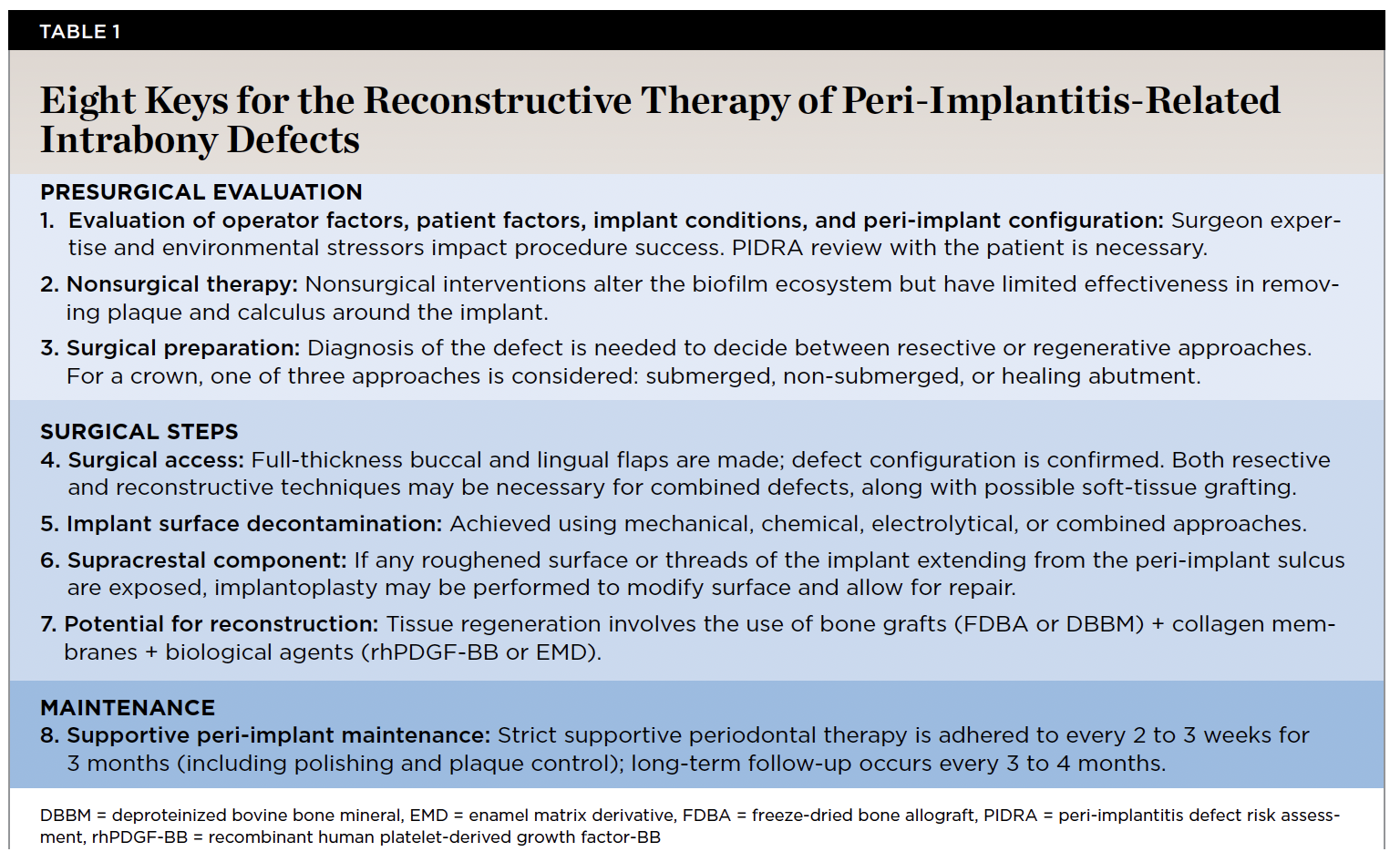 Risk assessment tools and clinical checklists are beneficial to avoid undue complications.8-11 Several of the present authors have described a 10-key checklist for immediate implant placement at esthetic sites12,13 as well as a seven-key checklist intended for treating periodontal intrabony defects.14 All implant procedures involve the biological response of the host ("host response"), the microbiological environment ("microbiology"), and treatment factors associated with the human operator ("human factors").8,15 This article examines this process and presents eight keys for peri-implantitis defect regenerative treatment (Table 1). Each key can be linked to one or more of these three categories.