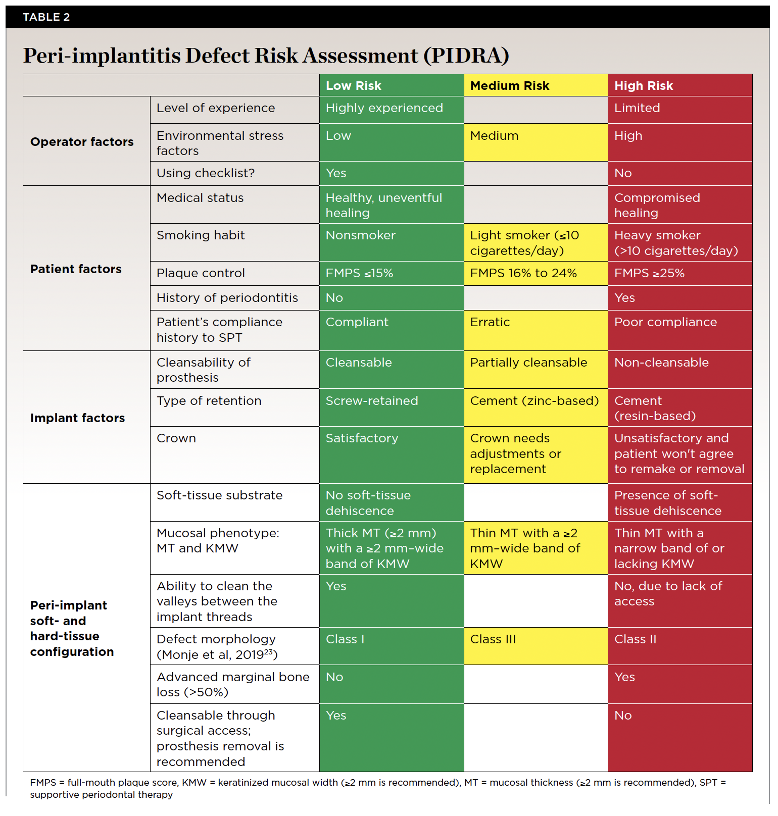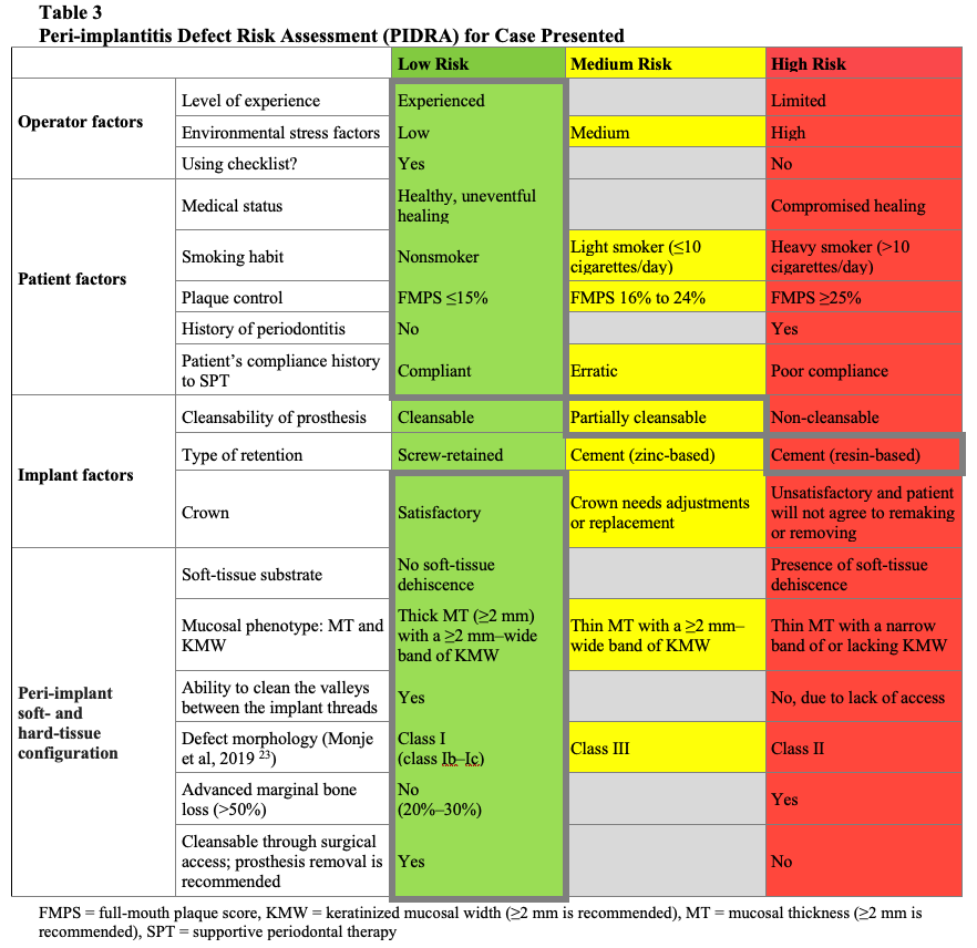 When conducting Key No. 1, performing a full-mouth periodontal and occlusal assessment and radiographic evaluation (including full-mouth periapical and/or cone-beam computed tomography imaging) is recommended, along with an assessment of implant position and prosthesis, as these factors may contribute to peri-implantitis progression.6 In addition to the medical and dental history, the periodontal, occlusal, and radiographic examinations are assessed and reviewed with the patient in a pretreatment consultation "knee-to-knee and eye-to-eye." Based on previously published studies and treatment guidelines,17-20 this article introduces a peri-implantitis defect risk assessment (PIDRA) tool to aid clinicians in identifying influential factors to achieve successful outcomes when performing regenerative procedures (Table 2). The PIDRA allows for predictable, standardized patient and professional communication regardless of risk level.