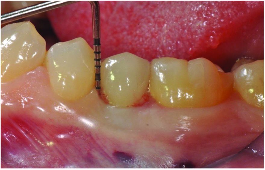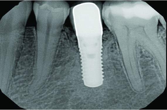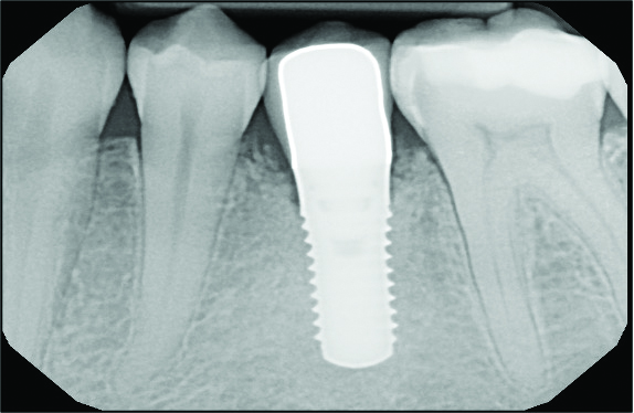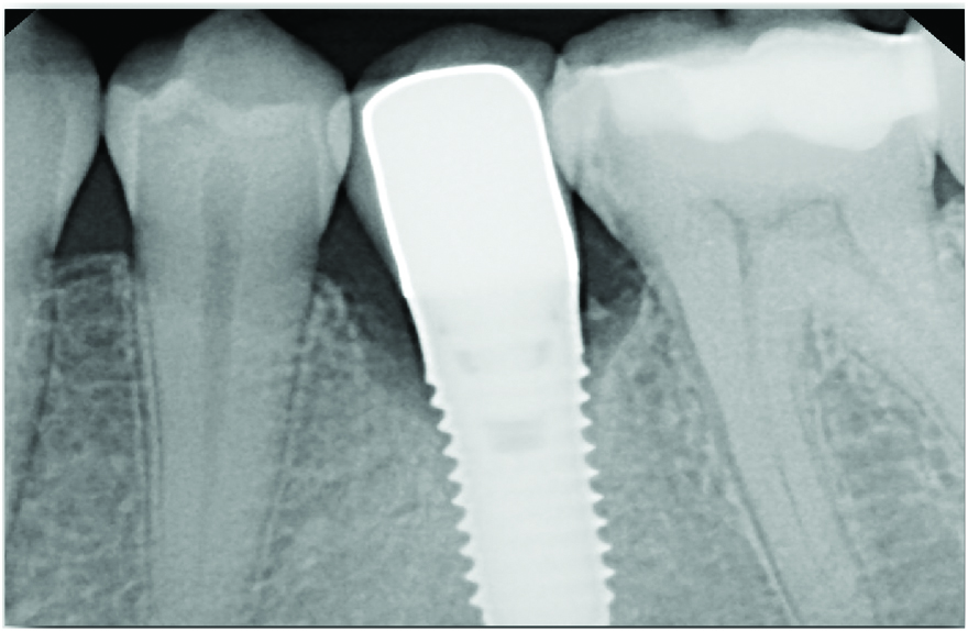 The following case report describes treatment of a circumferential intrabony defect with a buccal dehiscence (class Ib-Ic defect), which was diagnosed clinically. In 2007, a 40-year-old nonsmoking woman (American Society of Anesthesiologists [ASA] 1) with excellent periodontal health visited a periodontist for the replacement of a single missing mandibular premolar (tooth No. 20), which had been extracted 6 months before. A restorative-driven tapered implant with an SLActive® surface (4.1 mm x 10 mm) was placed using a customized anatomically correct surgical guide. At 3 months, a 3-mm solid abutment was torqued to 35 Ncm, followed by a final porcelain-fused-to-metal crown cemented with resin cement. The postoperative care protocol was exclusively under the care of the restorative dentist post-completion, as the patient was periodontally healthy with an excellent PRS of 3.