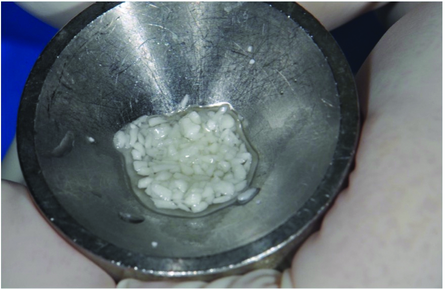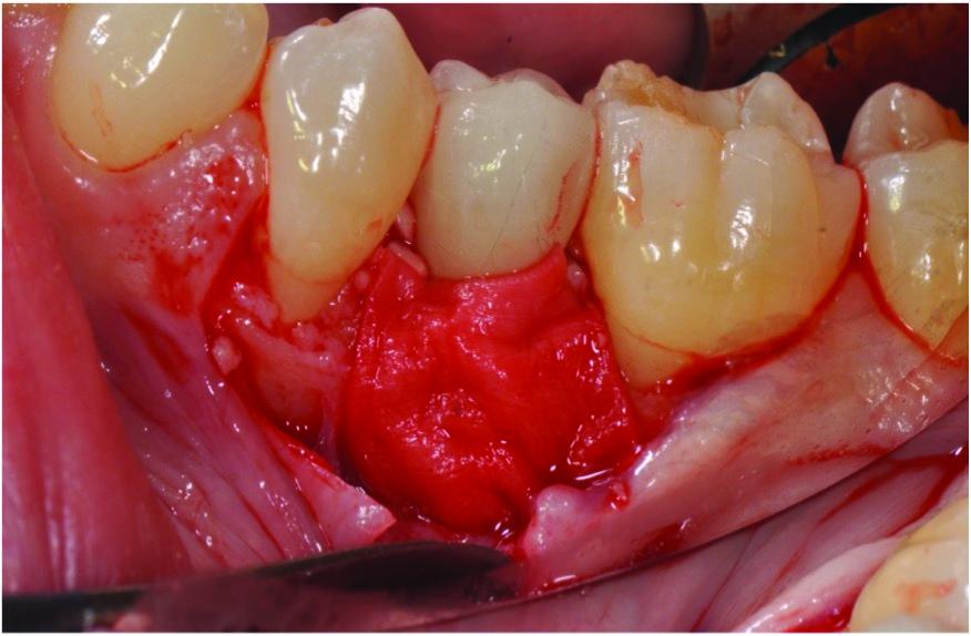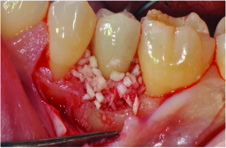 Curettes with small tips were used with ultrasonics to thoroughly clean the intrabony defect while not touching the implant surface (Figure 3 and Figure 4). The surface valleys and threads were carefully cleaned using an air polisher (sodium bicarbonate) for 1 minute, followed by sterile water irrigation of the site for 1 minute. After air drying, EDTA was applied for 1 minute, followed by sterile water rinse for 1 minute, with the previous steps repeated. The FDBA bone graft was soaked in sterile water, dried with a 2 x 2 gauze, and soaked in rhPDGF-BB (Figure 5).51 The bone graft was firmly packed into the defect with slight overpacking above the crest (Figure 6). A collagen membrane was divided in half and soaked in rhPDGF-BB. The collagen membranes were then adapted buccally and lingually with slight overlapping interproximally for graft containment (Figure 7). The flaps were passively positioned coronally and interproximally using nonresorbable 6-0 polypropylene sutures (Figure 8).