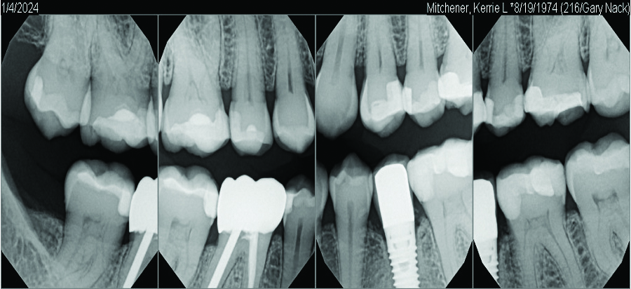 A postsurgical periapical x-ray was taken (Figure 9). Postoperative visits were at 2- to 3-week intervals. The patient was instructed to use chlorhexidine for 2 weeks, followed by the use of a two-row soft toothbrush and interproximal flossing. Interproximal proxy brush usage began after the suture removal at 4 weeks. After 2 months, healing was excellent (Figure 10); at 9 months, the interproximal papillae regeneration was complete, and radiographic confirmation of radiographic intrabony defect fill was observed (Figure 11 and Figure 12). After 1 year, maintenance visits were conducted by the restorative office's registered dental hygienist.