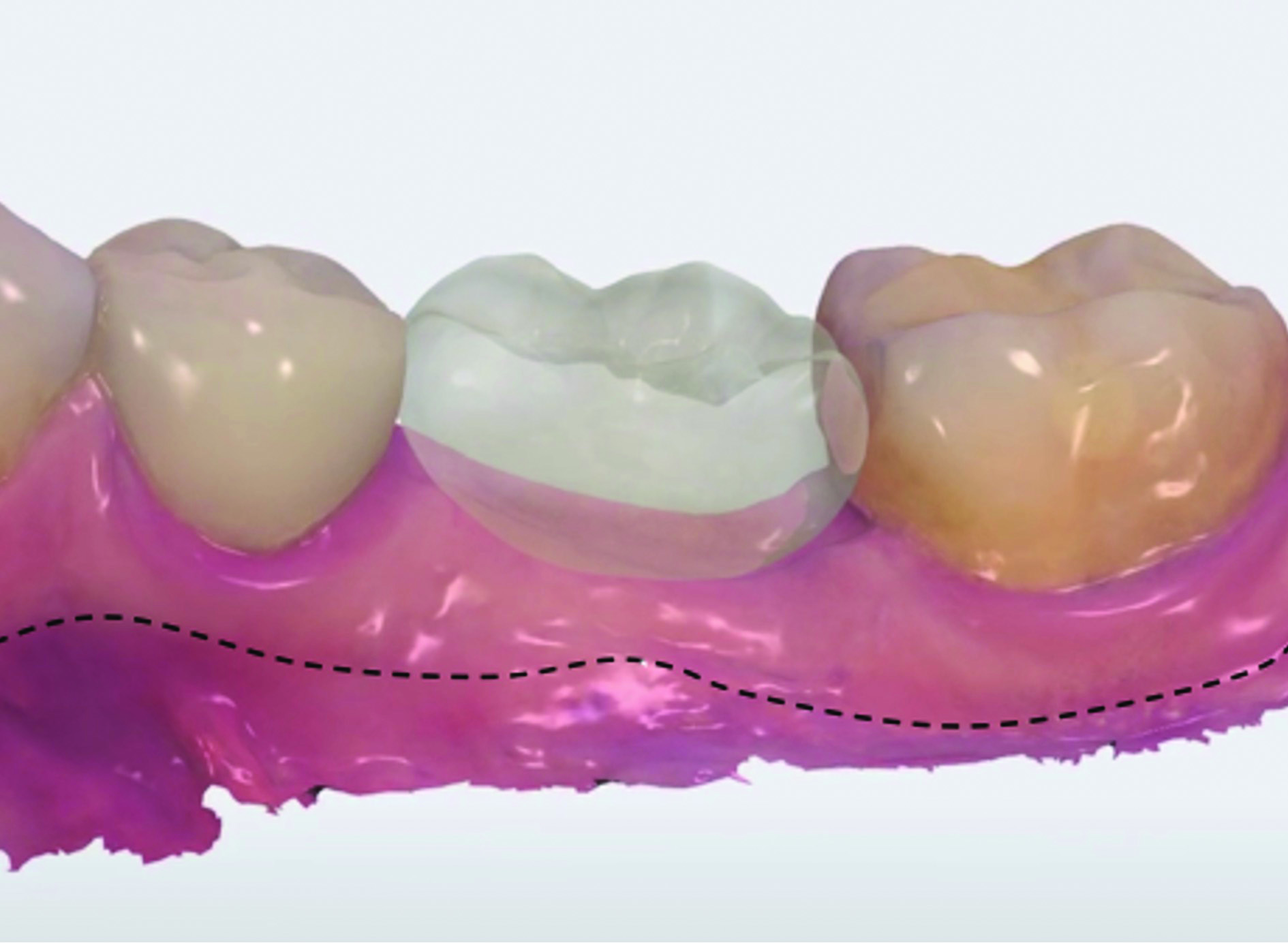 An example of an implant treatment planning case is presented in Figure 2 and Figure 4, with Figure 2 showing a digital scan of a mandibular arch that includes a missing tooth No. 19. The scan shows there was adequate KMW (>2 mm) at the No. 19 area. The digital scan of No. 19 was superimposed with a cone-beam computed tomography (CBCT) scan to analyze the future implant site. Upon superimposition, the MT could be measured at any surface (Figure 4). MT at the direct buccal and direct lingual aspects of the peri-implant mucosa was measured at >2 mm. The simulated future implant placement and the outlined safety zone of 1.5 mm radially and 2 mm apically around the implant indicate that the thickness of bone at the implant site was sufficient as planned. This case demonstrates there was enough KMW, bone thickness, and MT to proceed with implant placement.