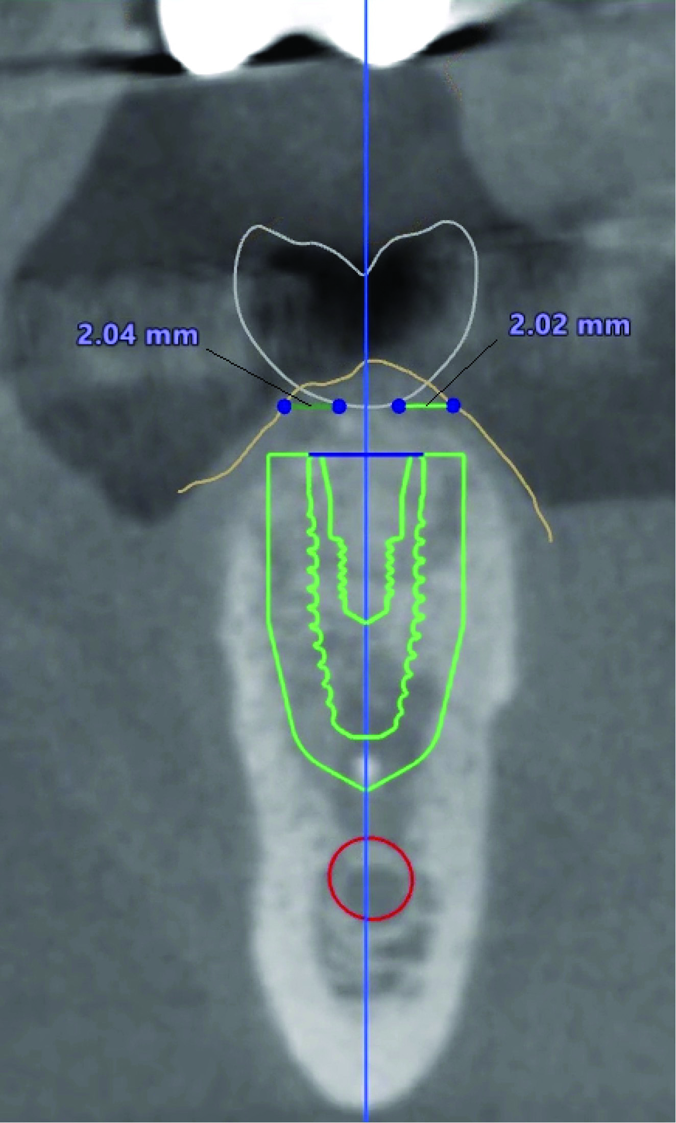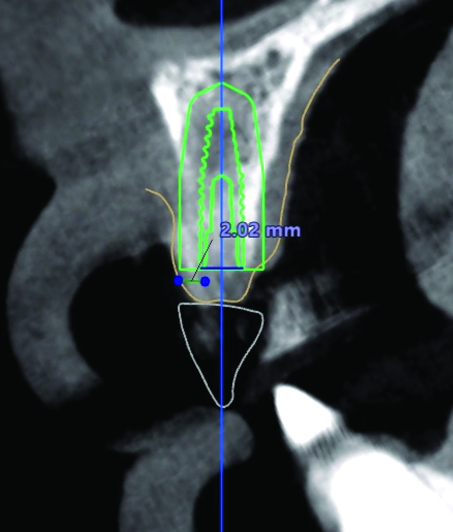 Another example of an implant treatment planning case, on a missing tooth No. 7, is shown in Figure 3 and Figure 5. There was adequate KMW (>2 mm) in the area of the missing tooth, but a concave contour was present on the buccal aspect of the ridge at the crest (Figure 3). A digital tooth set-up for the missing tooth No. 7 was superimposed with a CBCT. Upon superimposition, the MT could be measured at any surface (Figure 5). The simulated future implant placement and the safety zone marked around the implant indicate the thickness of the bone at the implant site was sufficient as planned. The MT, however, was <2 mm with clinical presence of a lack of soft-tissue volume. This clinical example demonstrates the need for soft-tissue enhancement to increase MT.