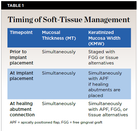Because greater attention has been paid more recently to soft tissue related to peri-implant health, interest in how to manage soft tissue in implant dentistry has heightened. When soft-tissue deficiency is noted, early intervention would be ideal to increase predictability. There are three timepoints for clinicians to address soft-tissue management: prior to implant placement, at the time of implant placement, or at the time of the healing abutment connection. The selection of a surgical technique and its timing depends on the condition of the specific case and the goal of the treatment. The goal could be to increase either KMW, MT, or both. Studies that compared soft-tissue grafting procedures found that such procedures overall were beneficial for maintaining healthy peri-implant mucosa and bone around dental implants. After the procedure, KMW was increased and there was less bleeding at peri-implant mucosal sites and better marginal bone level. The thickened mucosa was associated with less marginal bone loss.9,14,17