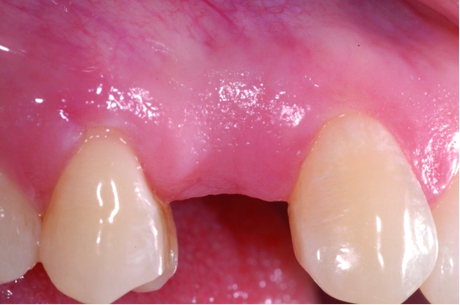 MT is the horizontal dimension of the peri-implant soft tissue and may or may not be keratinized. MT is an important aspect of implant esthetic outcomes, especially at the most coronal aspect around the implant restoration. Around thin mucosa the color of the underlying restoration material may show through and result in esthetic deficiencies (Figure 1). Conversely, thick tissue can minimize the shading effect of underlying restoration materials and may compensate for any bony dehiscence around the implant body. In a systematic review, it was reported that after soft-tissue augmentation was conducted to increase MT, less interproximal marginal bone loss resulted around the implant.9